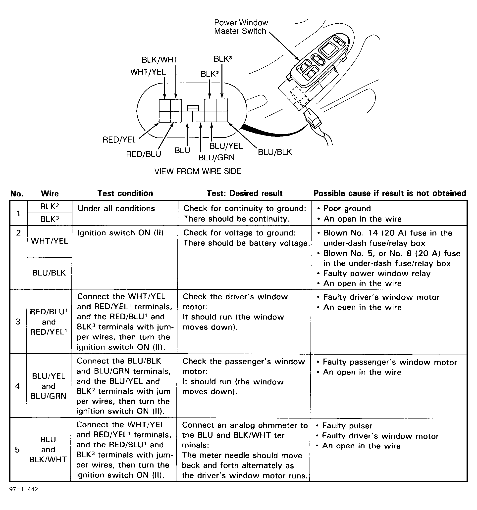 Driver's power window switch is integrated with control unit and cannot be isolated for testing. On hatchback (2-door) models, perform tests No. 1, 2, 3, and 5. On sedan (4-door) models, perform tests No. 1, 2, 3 and 7. See POWER WINDOW MASTER SWITCH INPUT TEST. See Figure
