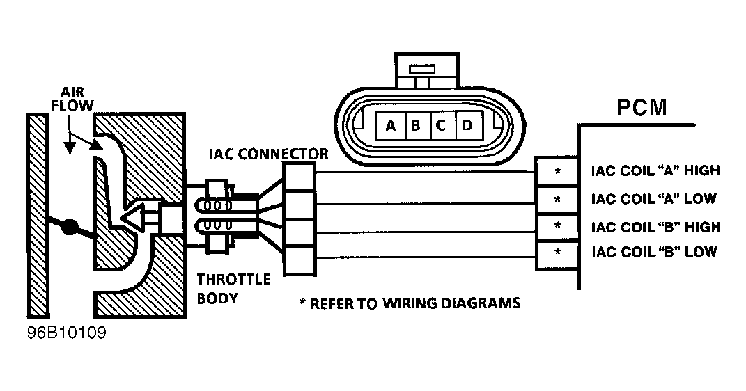 - Check resistance between IAC terminals "B" to "C" and "A" to "D". Resistance should be infinite. If resistance is not as specified, replace IAC valve. See Fig 1 .