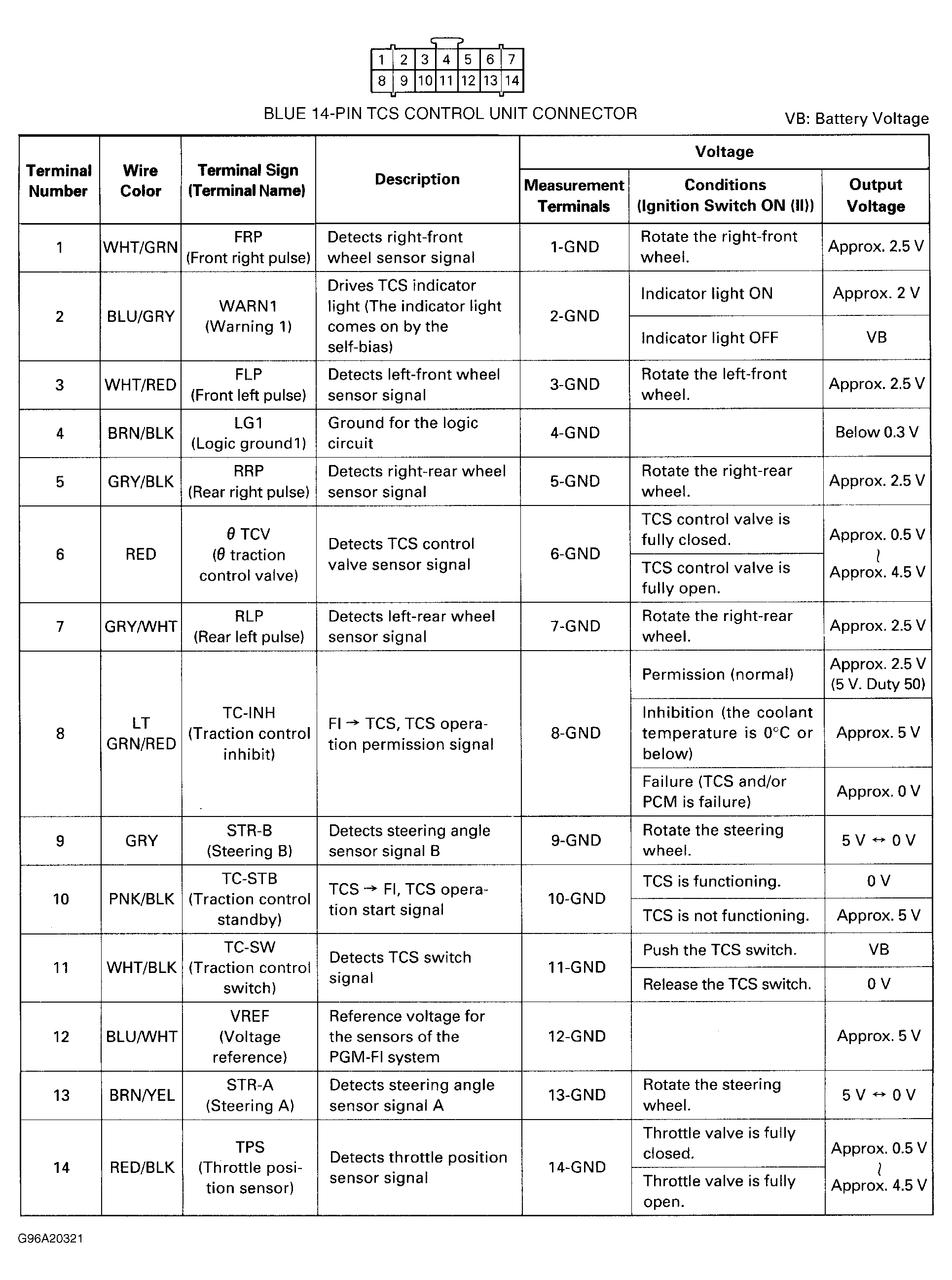 - Measure voltage between ground and steering angle sensor 5-pin connector terminal No. 5 (White/Blue wire). See Fig 1 . Reading should be approximately 5 volts. If reading is as specified, go to next step. If reading is not as specified, repair open in White/Blue wire between TCS control unit 20-pin connector terminal No. 16 and steering angle sensor 5-pin connector terminal No. 5. See WIRING DIAGRAMS .