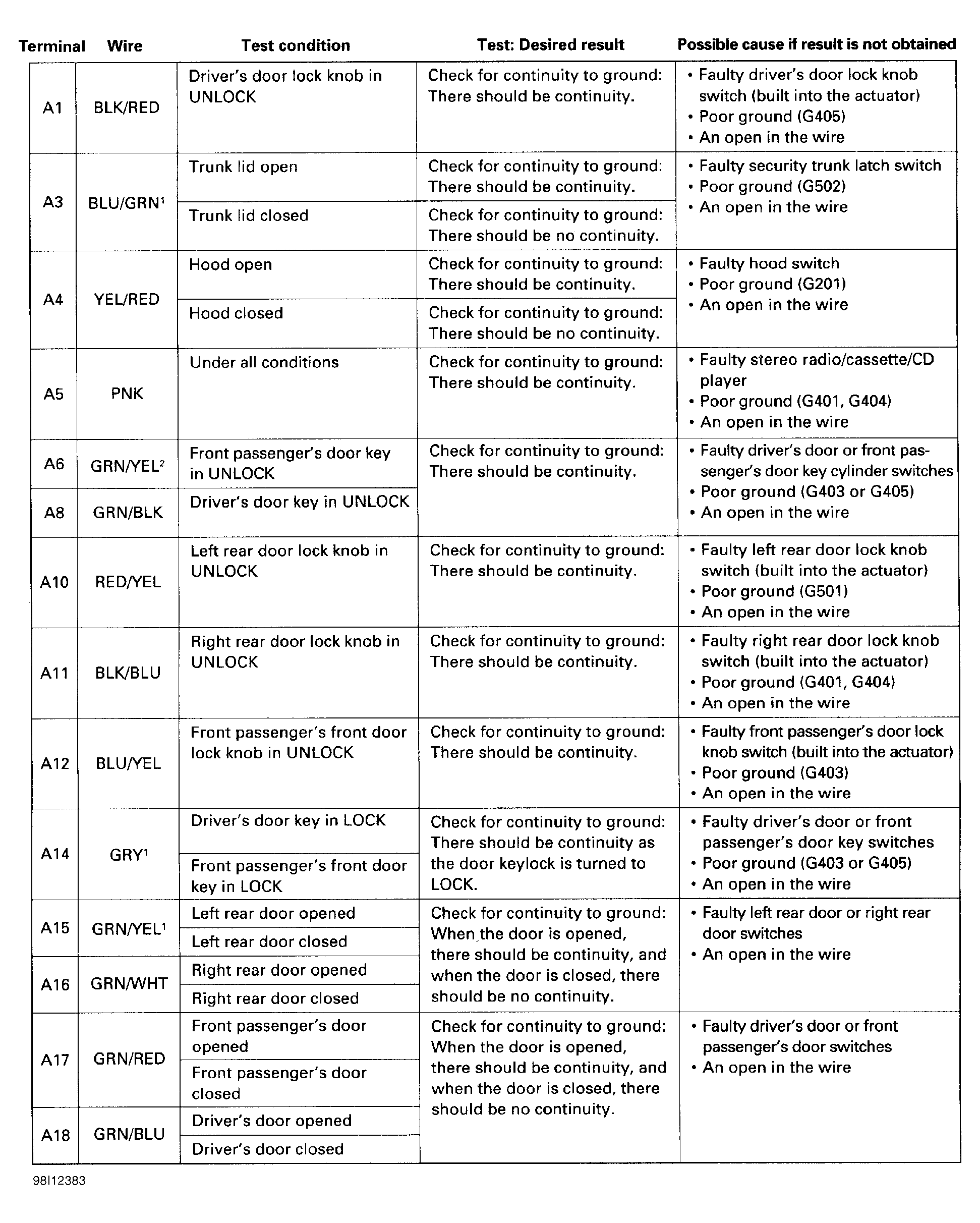 Remove glove box. Disconnect security control unit connectors. Inspect connectors and terminals. Check for bent, loose or corroded terminals. Perform security control unit input tests. See Fig 2 -8. If security control unit inputs are okay, replace faulty security control unit.