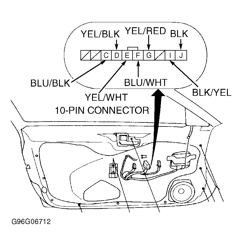- Connect a jumper wire between power mirror switch connector terminal "I" (Black/Yellow wire) and terminal "F" (Blue/White wire). See Fig 1. Connect a jumper wire between terminal "E" (Yellow/White wire) and ground. Right mirror should tilt down. If mirror does not tilt down, check for open in Yellow/White wire. If wire is okay, go to next step.