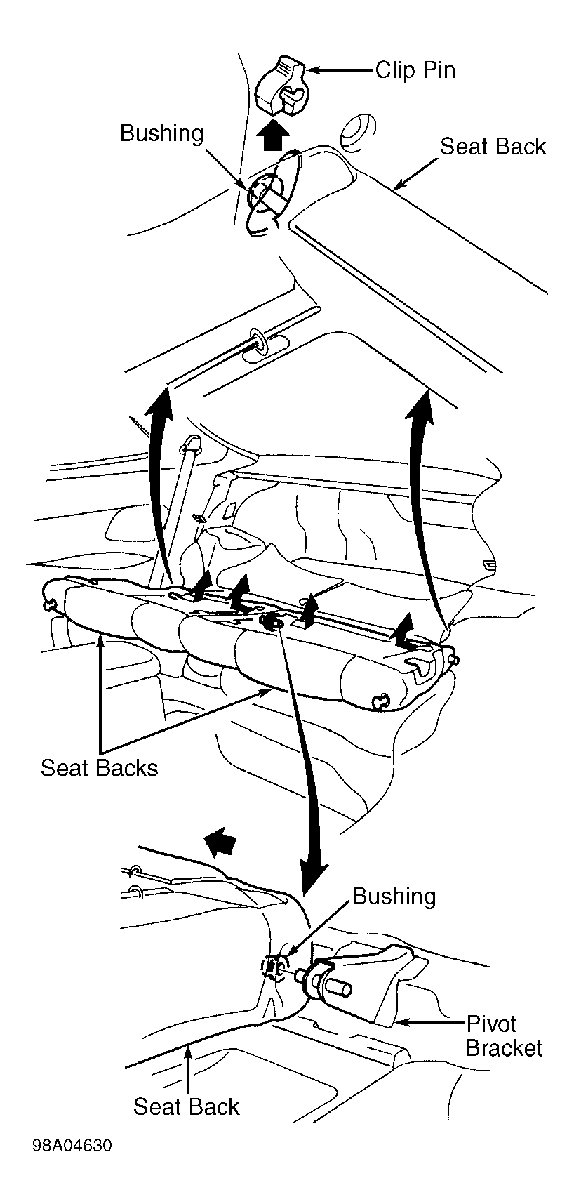 - Disconnect negative battery cable. On hatchback models, fold seat-backs forward. Remove clips securing trunk mat to seat-backs and remove trunk mat. Remove clip pin on both sides of seat. See Fig 1. Slide seat-backs outward and remove seat-backs from pivot bracket. See Fig 1. Remove bolts located behind center of seat cushion. Disconnect seat cushion securing hooks and seat cushion.