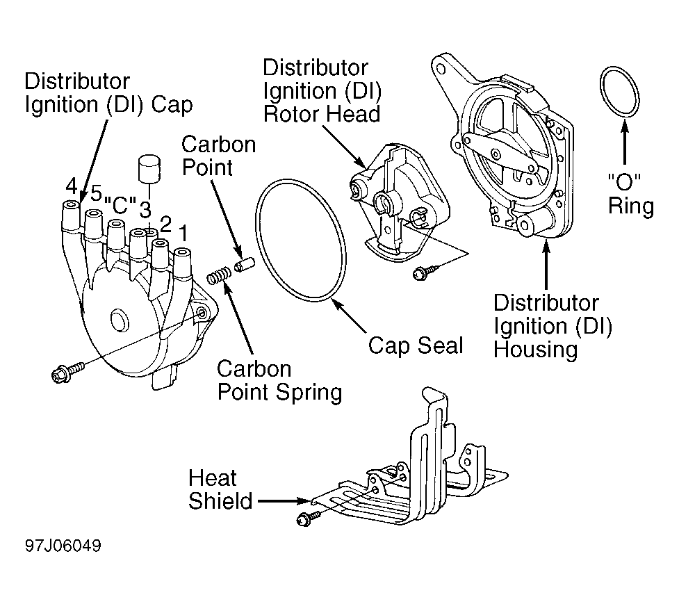 - Note location of each spark plug wire. Disconnect wires from distributor cap. Remove hold-down bolts, distributor, heat shield and seal.