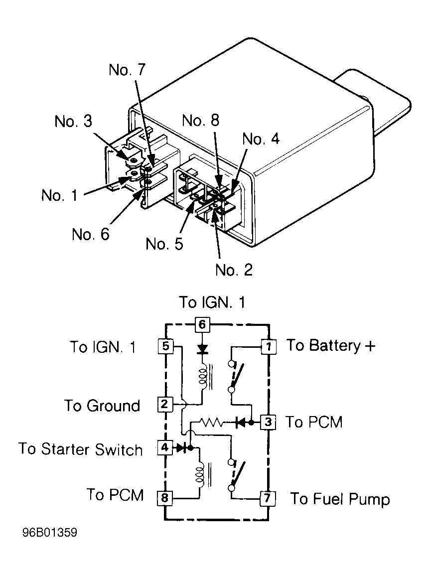 - Connect battery voltage to relay terminal No. 3. Connect terminal No. 8 to ground. Test for continuity between relay terminals No. 5 and 7. If continuity exists, relay is okay. If continuity does not exist, replace relay.
