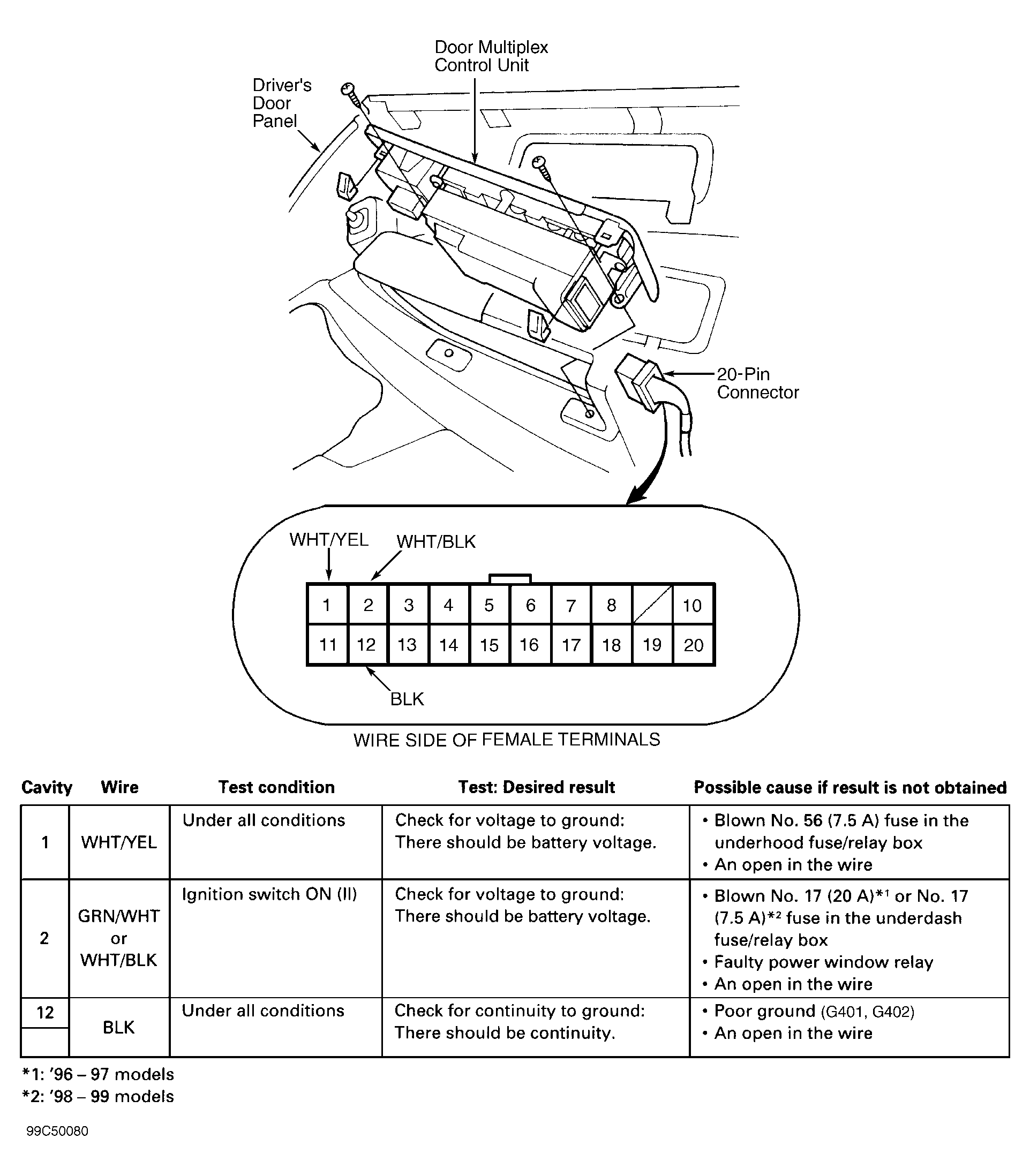 Turn ignition off. Remove driver's door trim panel enough to gain access to door multiplex control unit connector. Disconnect door multiplex control unit Blue 20-pin connector. Inspect connectors and terminals. Check for bent, loose or corroded terminals. Repair connector terminals as necessary and retest system. Perform driver's door multiplex control unit input tests. See Fig 1 . Repair as necessary and recheck system operation. If input tests are okay, replace power window master switch (door control unit).