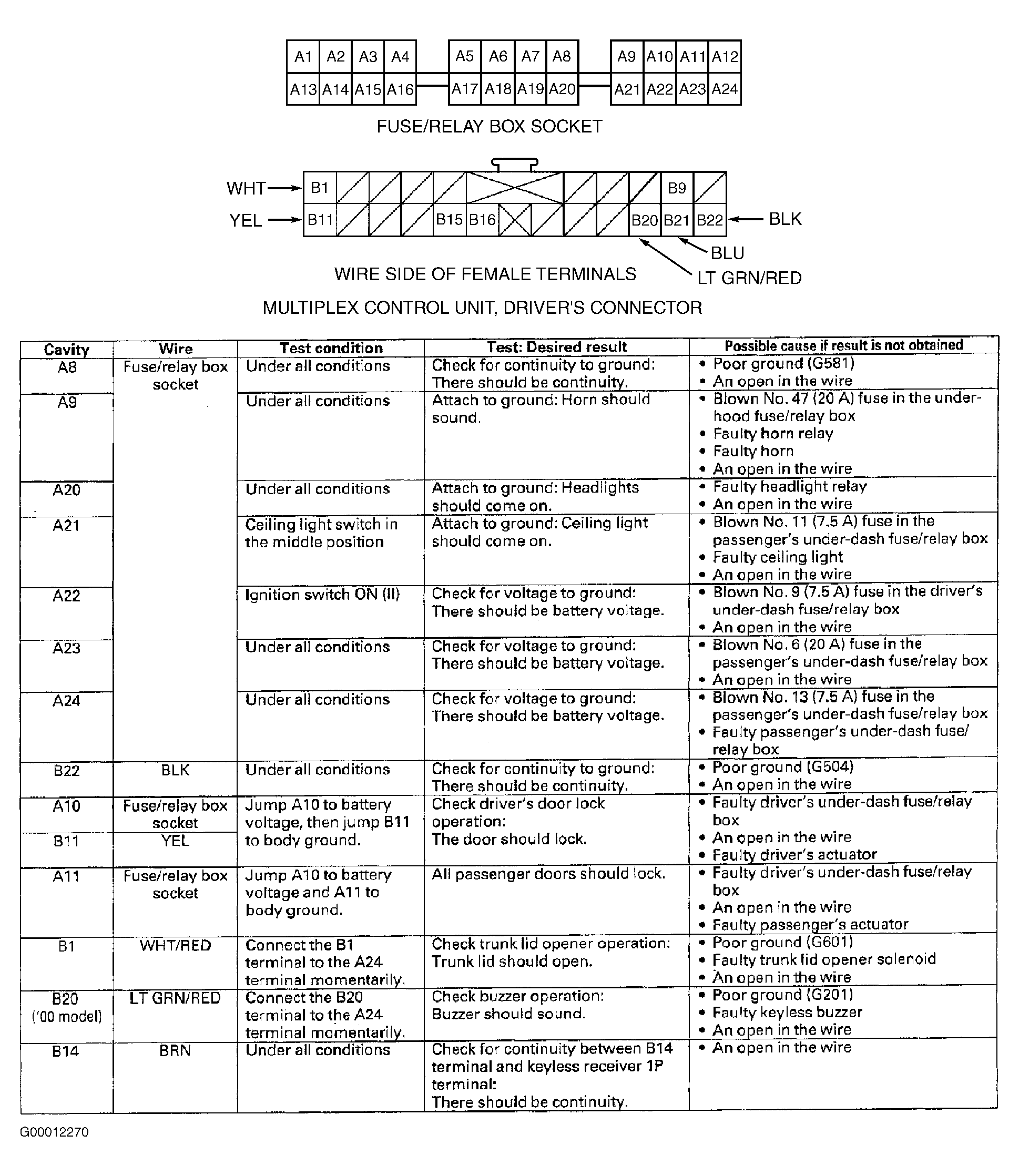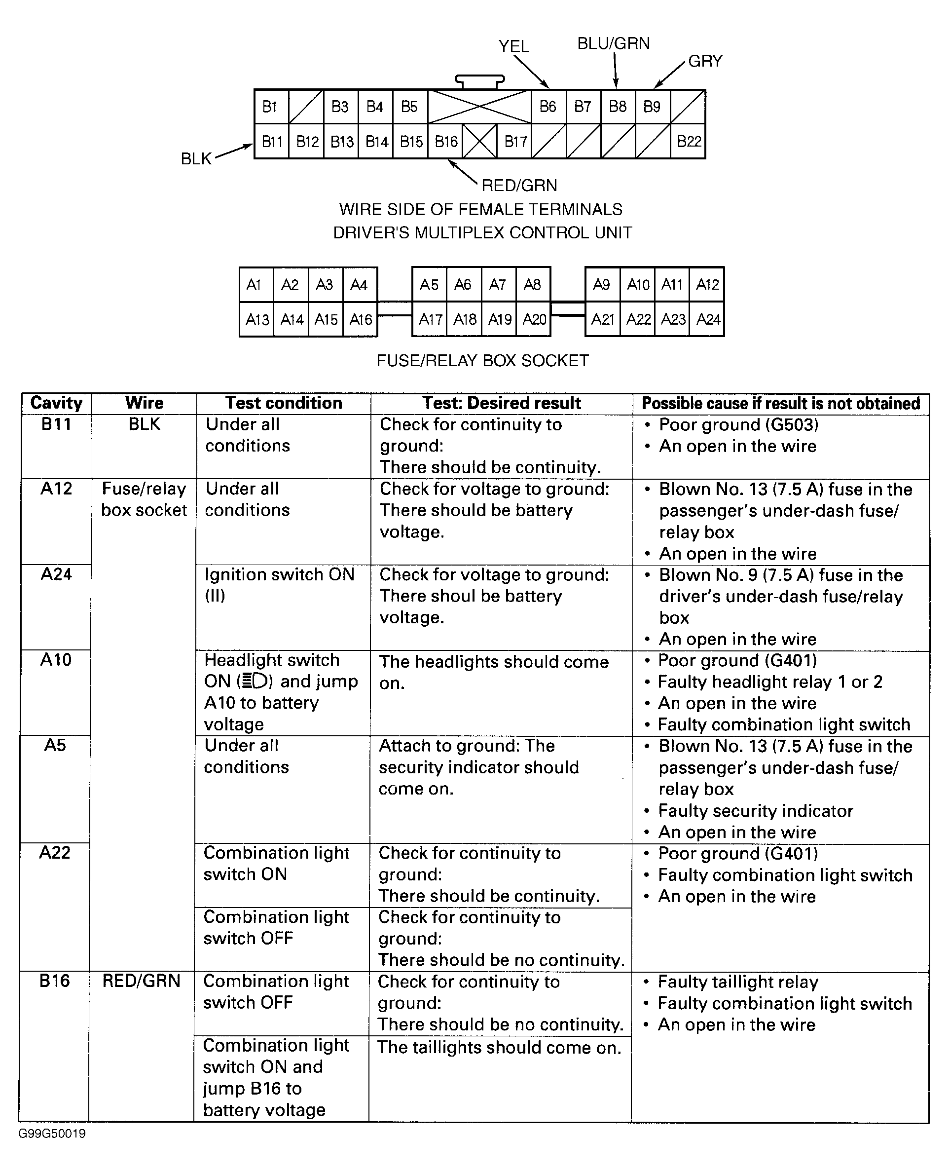 - Reconnect driver's multiplex control unit to underdash fuse/relay box. Perform input tests as specified at back side of driver's fuse/relay box (backprobe). See Fig 2