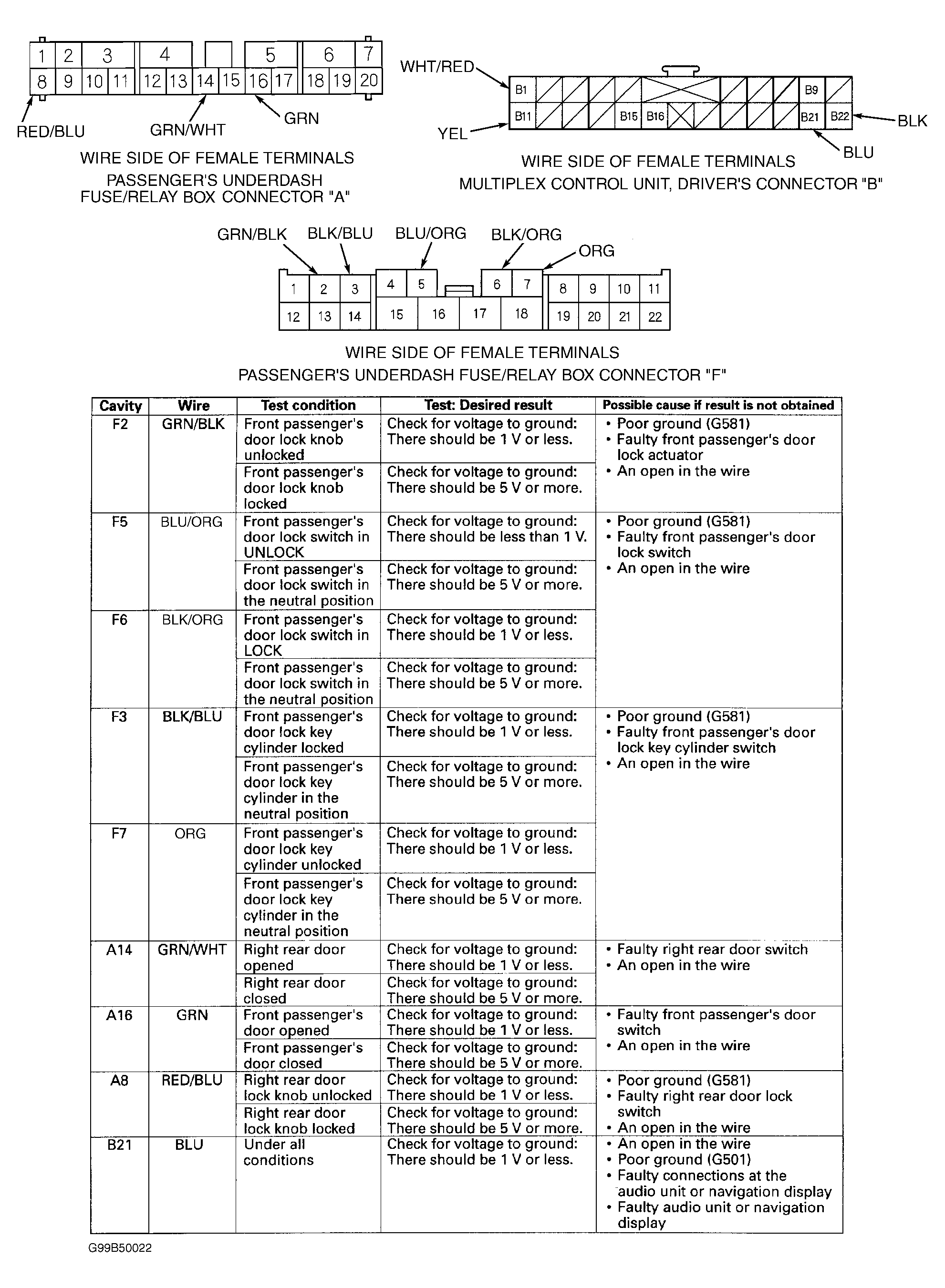 . Repair as necessary. If all tests are okay, reconnect passenger's multiplex control unit Green 22-pin connector and go to next step.