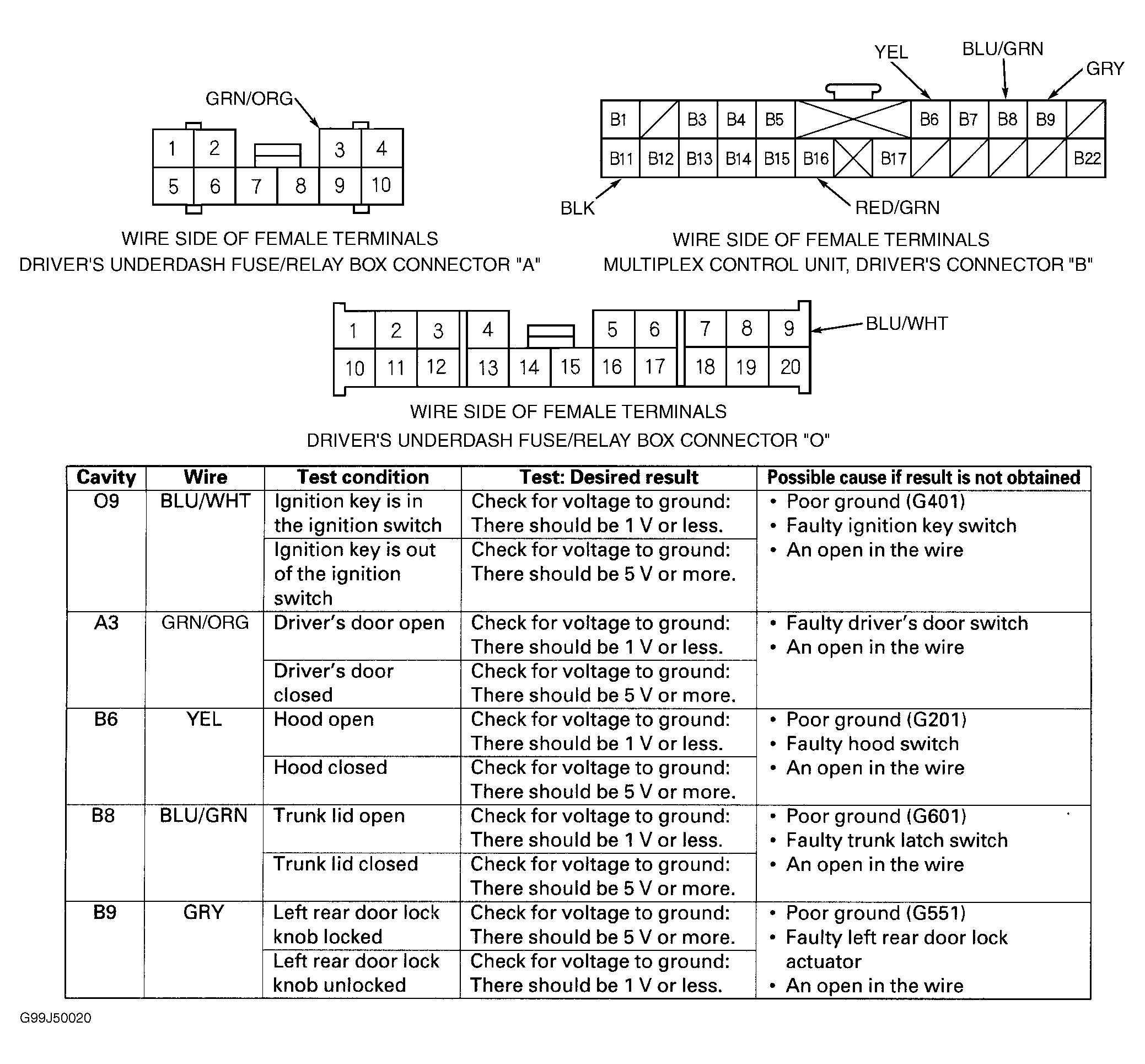 - Reconnect driver's door multiplex control unit 20-pin connector. Perform input tests as specified at back side of driver's door multiplex control unit 20-pin connector (backprobe). See Fig 6