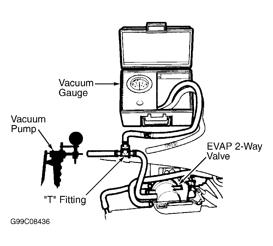 - Remove fuel filler cap. Remove vapor hose from EVAP 2-way valve. Connect "T" fitting to disconnected hose. Connect vacuum pump to one "T" fitting port and vacuum gauge to other "T" fitting port. See Fig 5. Apply vacuum slowly and continuously while observing gauge. If vacuum stabilizes momentarily at .2-.6 in. Hg, go to next step. If vacuum does not stabilize momentarily at .2-.6 in. Hg, replace valve.