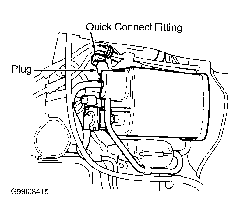 - Turn ignition off. Disconnect purge line hose from canister at metal line. Plug disconnected hose. See Fig 4. Turn ignition on. Measure voltage between PCM 32-pin connector terminal No. 29 (Light Green wire) and PCM 31-pin connector terminal No. 18 (Green/Yellow wire) while slowly pumping vacuum pump. Continue to pump vacuum until voltage drops to about 1.5 volts. Ensure engine coolant temperature is greater than 95°F (35C°) and vacuum pump has no leak. Monitor voltage for 20 seconds. If voltage drops to 1.5 volts and holds for at least 20 seconds, check EVAP purge control solenoid valve and connections. Repair as necessary. If EVAP purge control valve and connections are okay, go to next step. If voltage does not drop to 1.5 volts and hold for at least 20 seconds, check EVAP control canister vent shut valve and "O" ring for leakage. If EVAP control canister vent shut valve and "O" ring are okay, replace EVAP control canister.