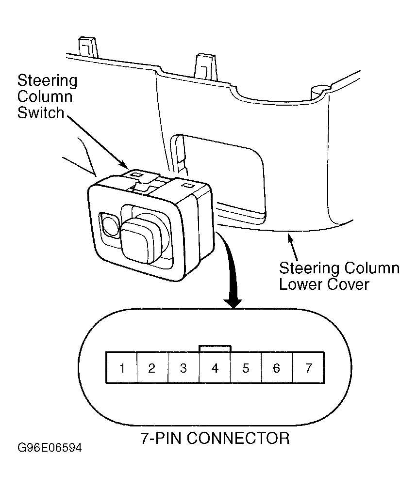 Disable air bag system. See appropriate AIR BAG RESTRAINT SYSTEMS article. Remove steering column covers. See STEERING COLUMN COVERS under REMOVAL & INSTALLATION. Disconnect steering column switch 7-pin connector and remove switch from steering column lower cover. See Fig 1 . Using an ohmmeter, verify continuity is as specified in STEERING COLUMN SWITCH CONTINUITY table. If switch fails any test, replace faulty switch.