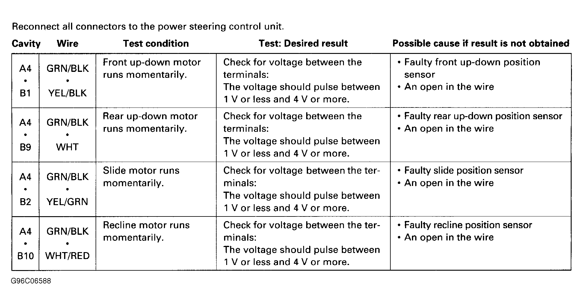 2. Reconnect power seat control unit connectors. Perform second part of power seat control unit input test at back of power seat control unit connectors (backprobe). See Fig 3 . Repair as necessary. If all tests are okay, go to next step.
