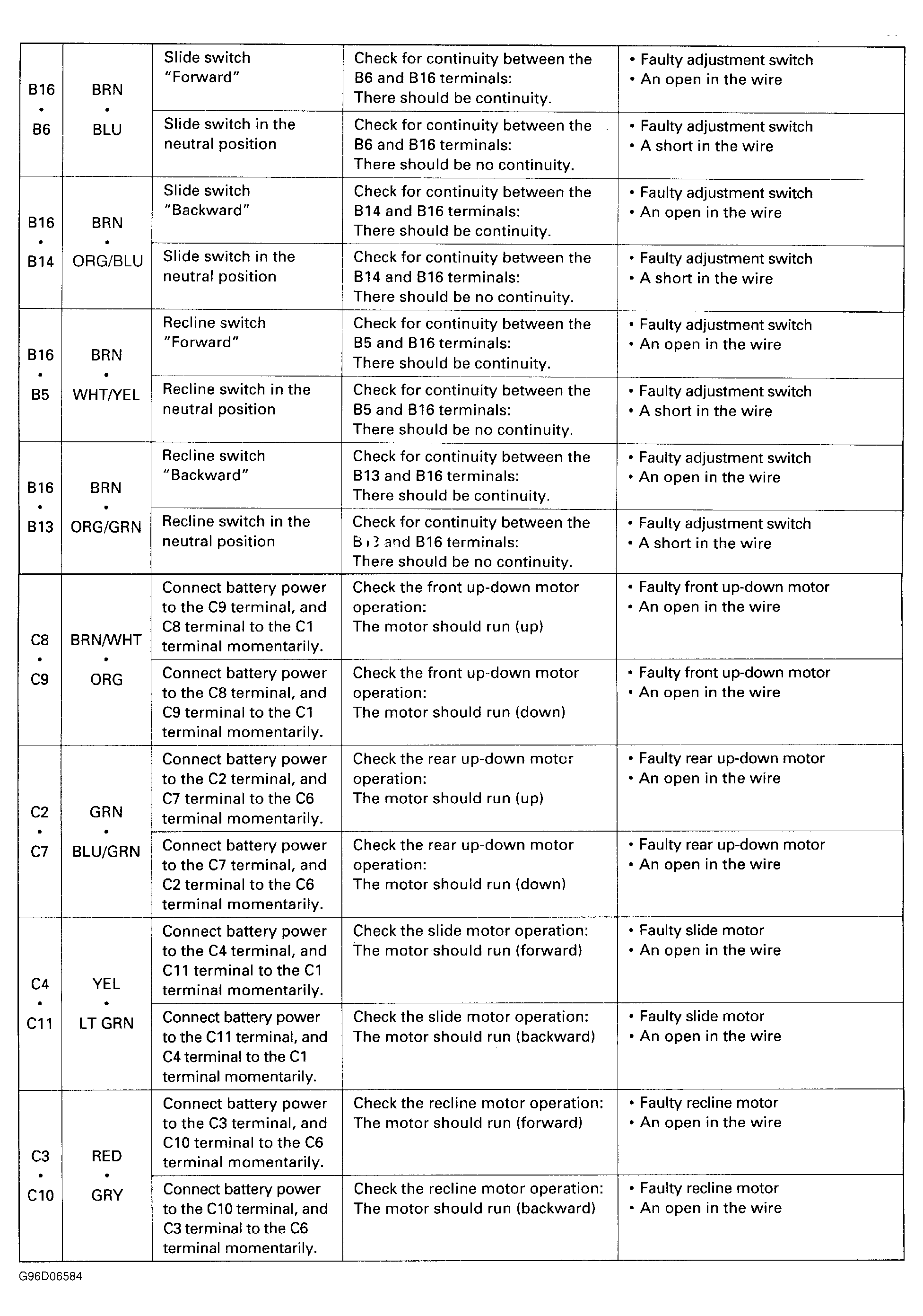 1. Power seat control unit is located under front center of driver's seat. See FRONT SEAT  under REMOVAL & INSTALLATION. Disconnect power seat control unit connectors and check for bent, loose or corroded terminals. Repair as required. Perform first part of power seat control unit input test. See Fig 1 and Fig 2 . Repair as necessary and recheck system operation. If power seat control unit tests are okay, go to next step.