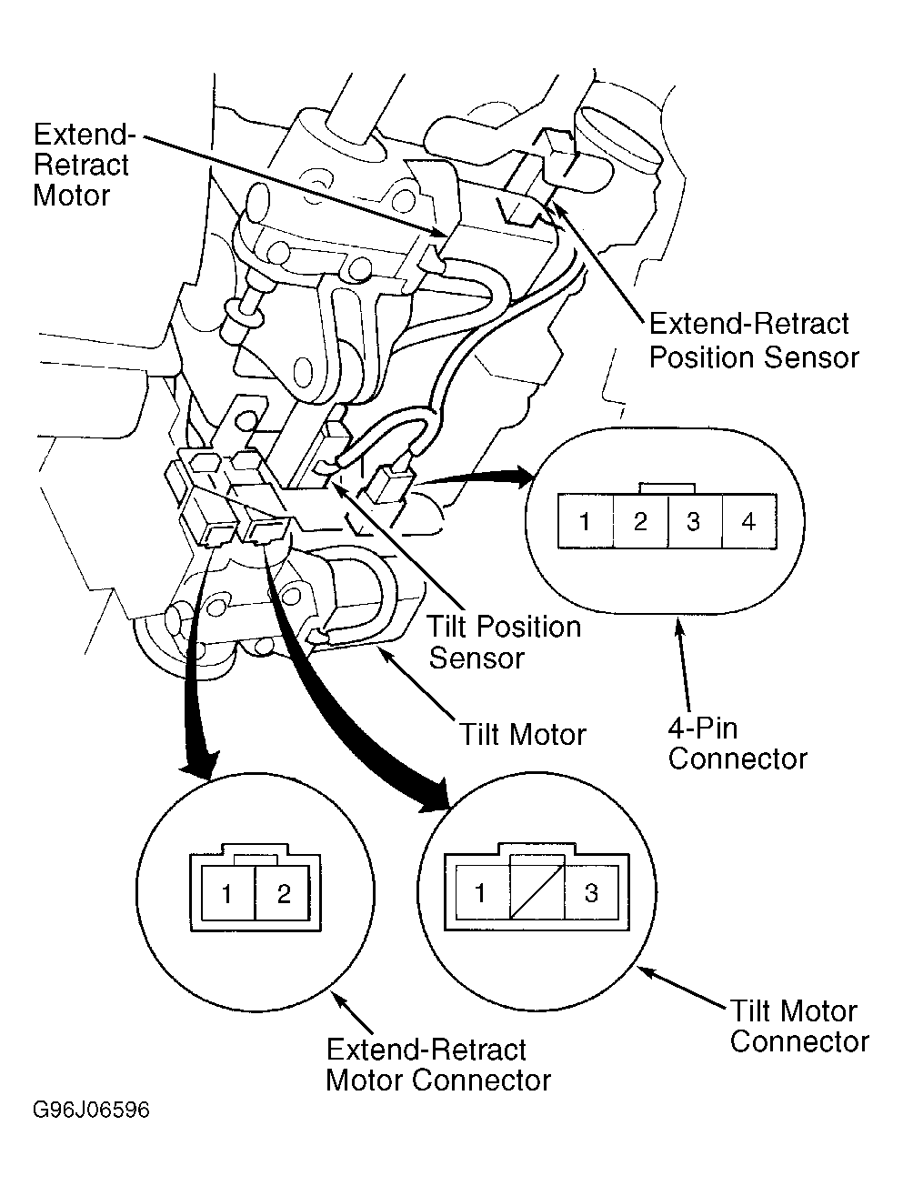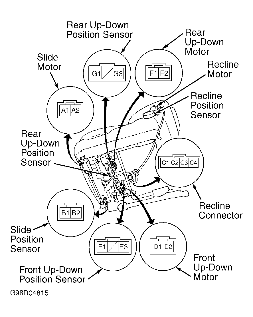 On driver's seat, 4 motors provide for front up/down, rear up/down, forward/back, and recline adjustment. See Figure . Additionally, 2 motors are used to adjust steering column position. See Figure . Each motor includes a reed-switch sensor, which sends a pulse signal to DPMS control unit.