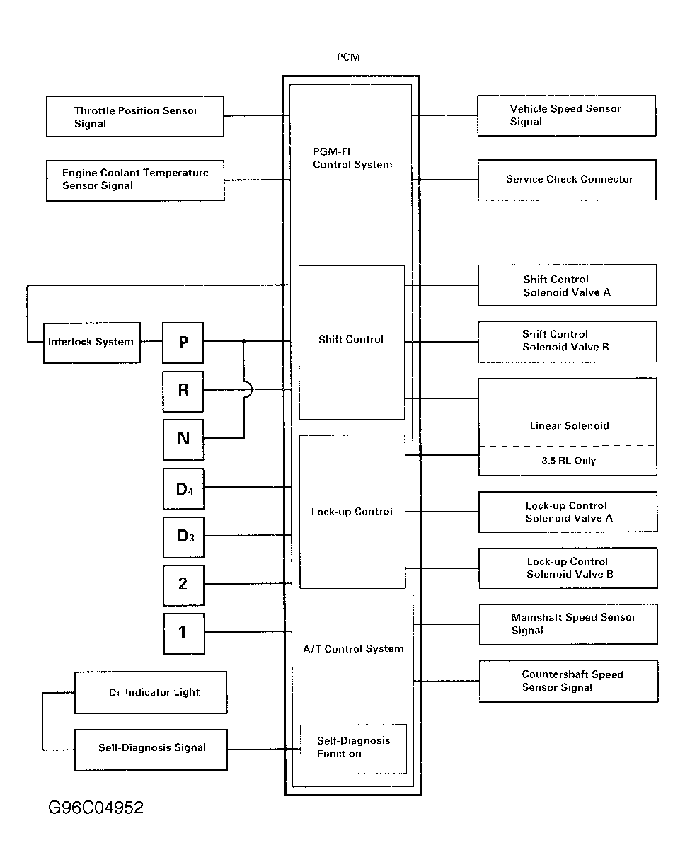 PCM receives information from various input devices and uses this information to control linear solenoid along with shift and lock-up control solenoid valves. See Figure . PCM contains a self-diagnostic system which stores Diagnostic Trouble Code (DTC) information if a failure or problem exists in transaxle electronic control or fuel injection system. DTC or flash code can be retrieved to determine transaxle problem area. PCM is located under carpet on passenger's side footwell.