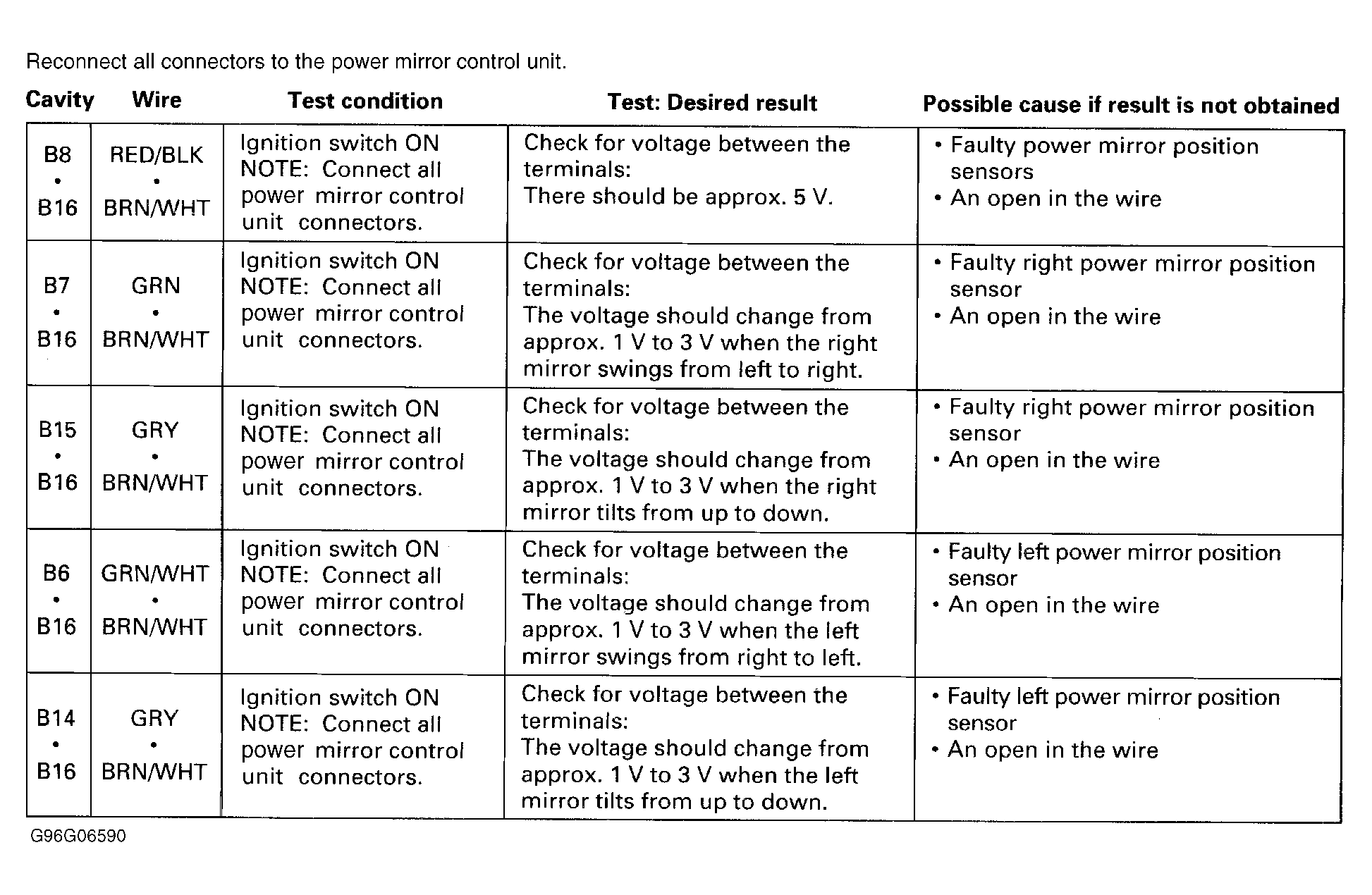 1. Power mirror control unit is located behind driver's door panel. See DOOR PANEL  under REMOVAL & INSTALLATION. Disconnect power mirror control unit connectors and check for bent, loose or corroded terminals. Repair as required. Perform first part of power mirror control unit input test. See Fig 1 . Repair as necessary and recheck system operation. If power mirror control unit tests are okay, go to next step.