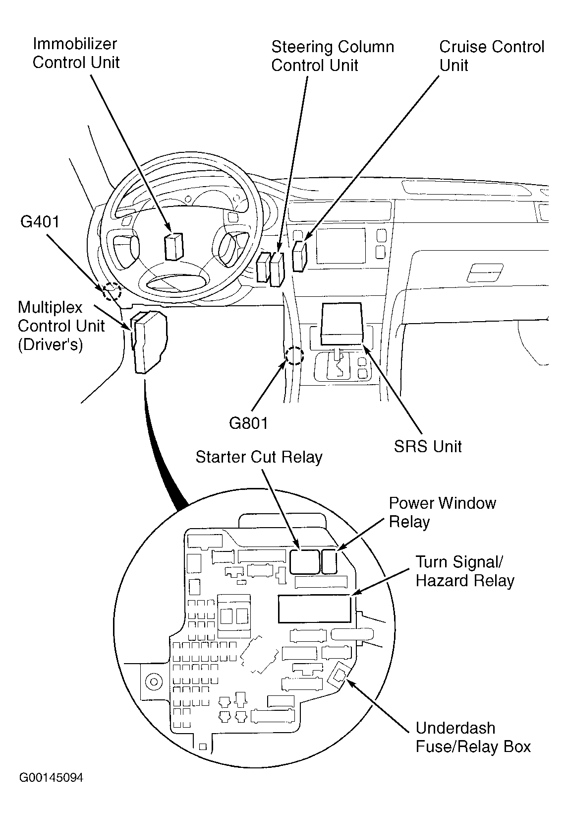 Multiplex Control Unit (Driver's) Behind left kick panel, on underdash fuse/relay box. See Figure .