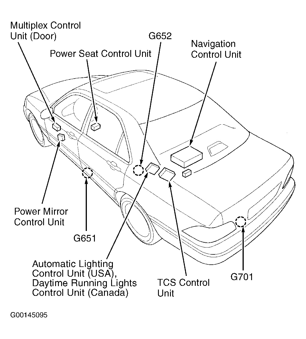 Daytime Running Lights (DRL) Control Unit (Canada) Behind left side of rear seat. See Figure .