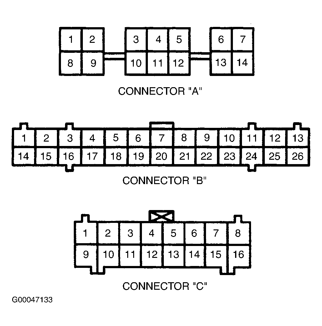 - Turn ignition on. Check for voltage between driver's multiplex control unit harness connector "C" terminal No. 2 (Black/Blue wire) and ground. If voltage does not exist, check for loose driver's multiplex control unit connectors. Repair as necessary. If connectors are okay, substitute a known-good driver's multiplex control unit and retest. If voltage exists, repair open in Black/Blue wire between multiplex control unit harness connector "C" and A/T gear position switch.