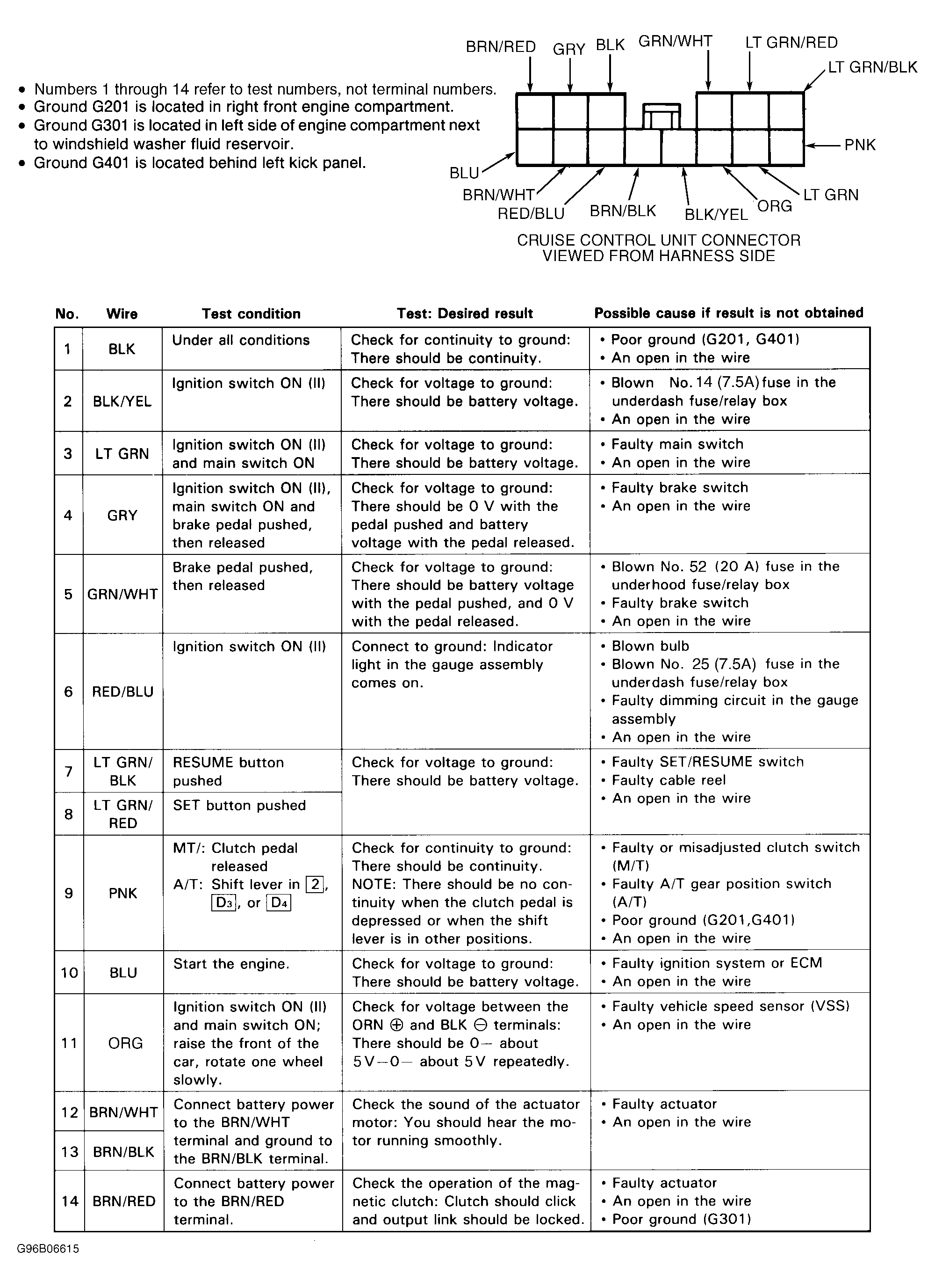 - Disconnect cruise control unit 14-pin connector. Ensure connector and terminals are okay. Repair as necessary and retest system. If connector and terminals are okay, use a DVOM to perform cruise control unit input tests. See Fig 1