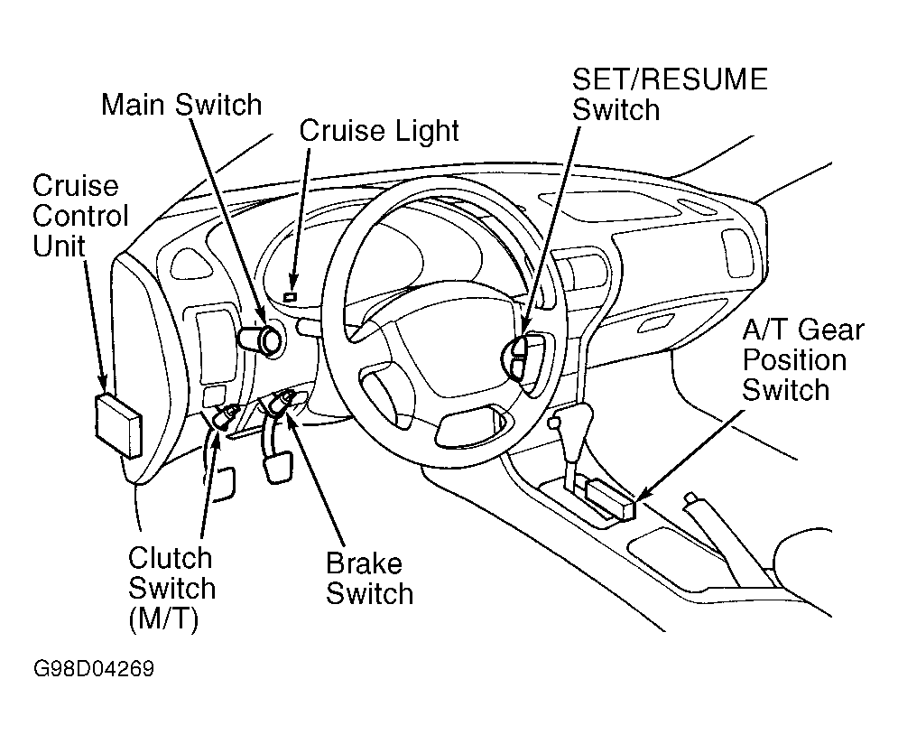 AIR BAG RESTRAINT SYSTEMS article. Remove instrument panel lower left cover. Remove left knee bolster. Cruise control unit is located near left kick panel. See Figure