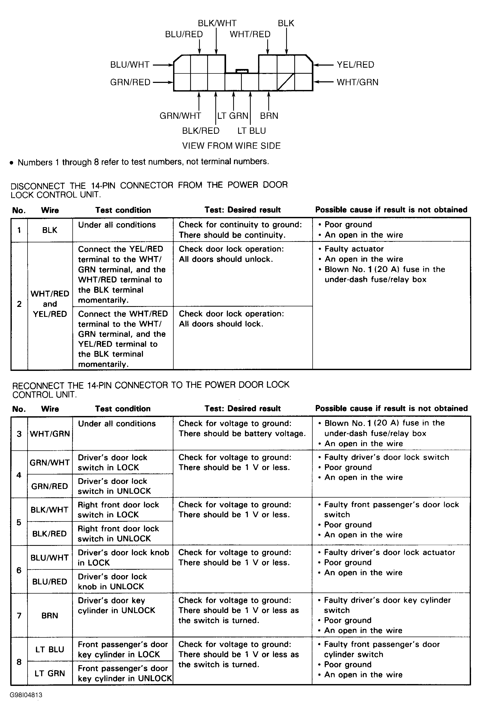 - Using a DVOM, perform power door lock unit input tests. See Fig 1 . If all input test results are okay, inspect connector and terminals for damage and proper fit. If connector is okay and power door lock still malfunctions, replace power door lock control unit.