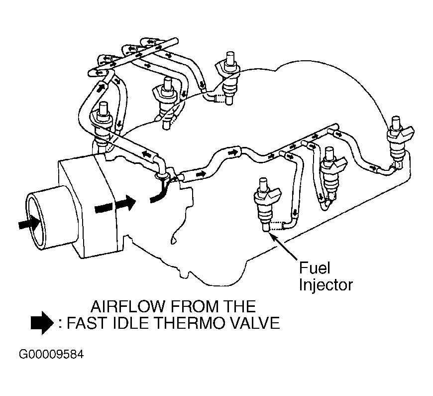 1. Start engine and run at 3000 RPM, with no loads and transmission in Park or Neutral, until radiator fan comes on. Allow engine to idle. Disconnect vacuum hoses individually from each injector. See Fig 1. Connect vacuum gauge and measure vacuum at each injector hose while idling.