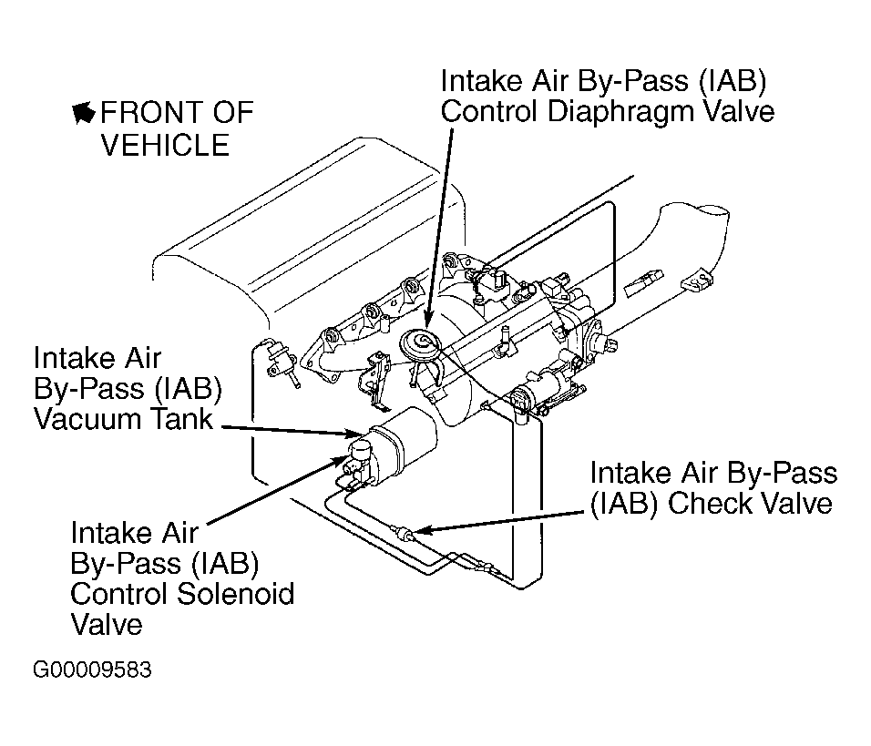 7. Disconnect IAB control solenoid valve 2-pin connector. Check for vacuum at IAB control diaphragm hose. If vacuum exists, replace IAB control solenoid valve. If vacuum does not exist, go to next step.