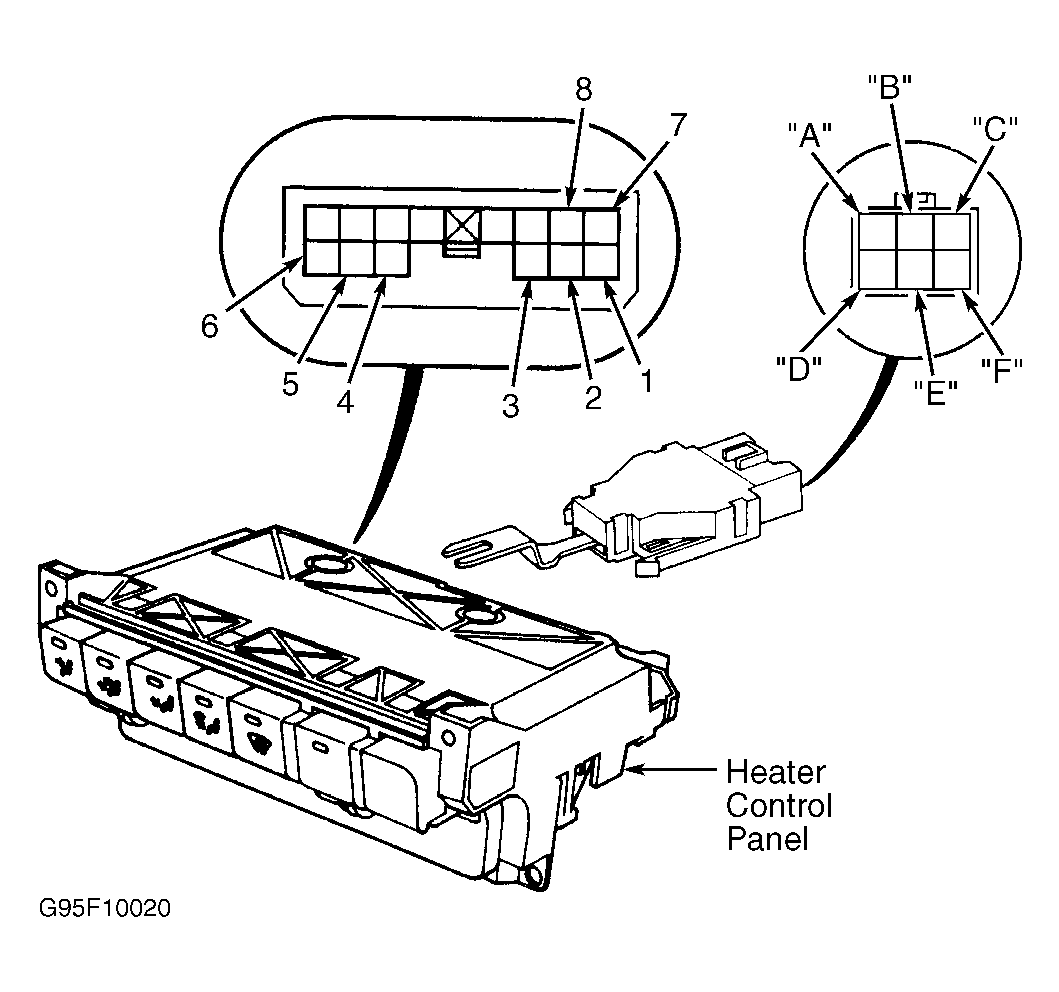 With fresh/recirculated air button in fresh air position, continuity should exist between terminals No. 4 and 6. See Fig 1 . With button in recirculated air position, continuity should exist between terminals No. 4 and 5. If continuity is not as specified, replace heater control panel.