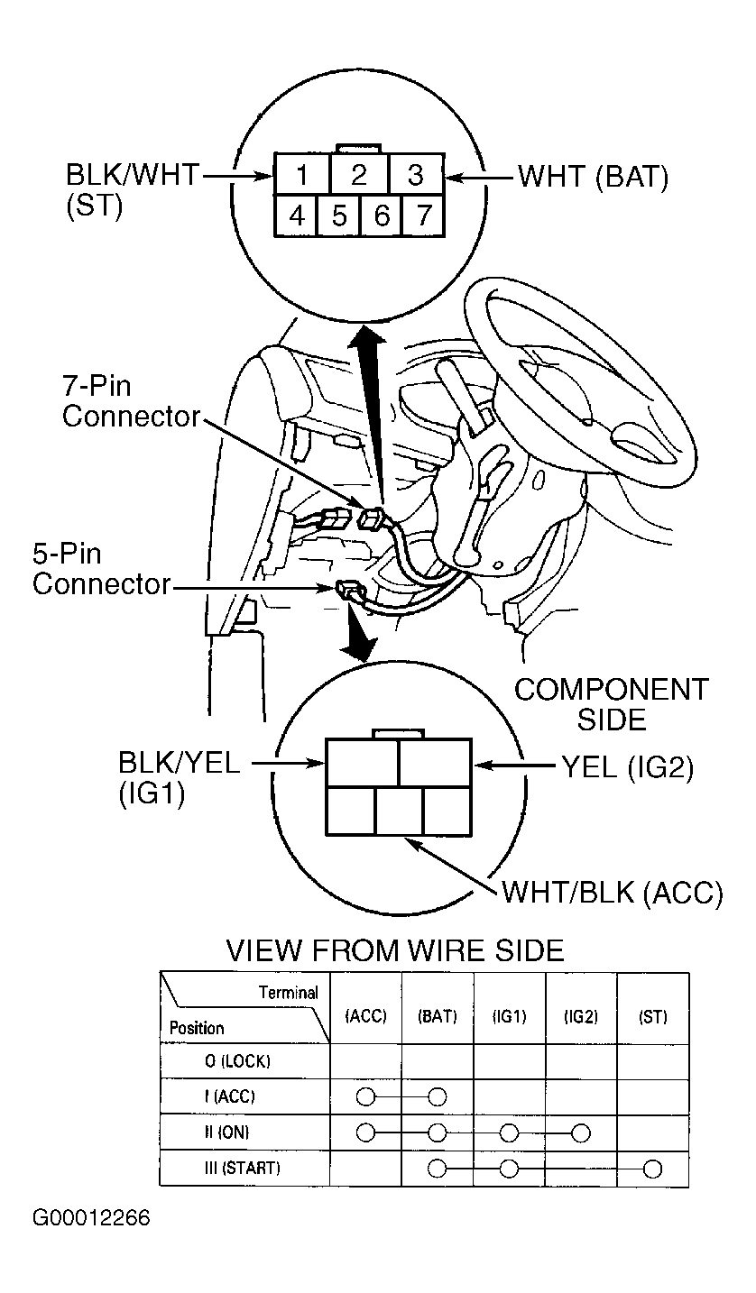 Disconnect negative battery cable. Remove lower instrument panel cover and driver-side knee bolster. Disconnect 7-pin and 5-pin connector (Integra), 6-pin connector (3.2TL) or 7-pin connector (3.5RL) from steering column harness. With ignition switch in appropriate position, check continuity between specified connector terminals. See Fig 1 and Fig 4 . If continuity is not as specified, replace ignition switch.