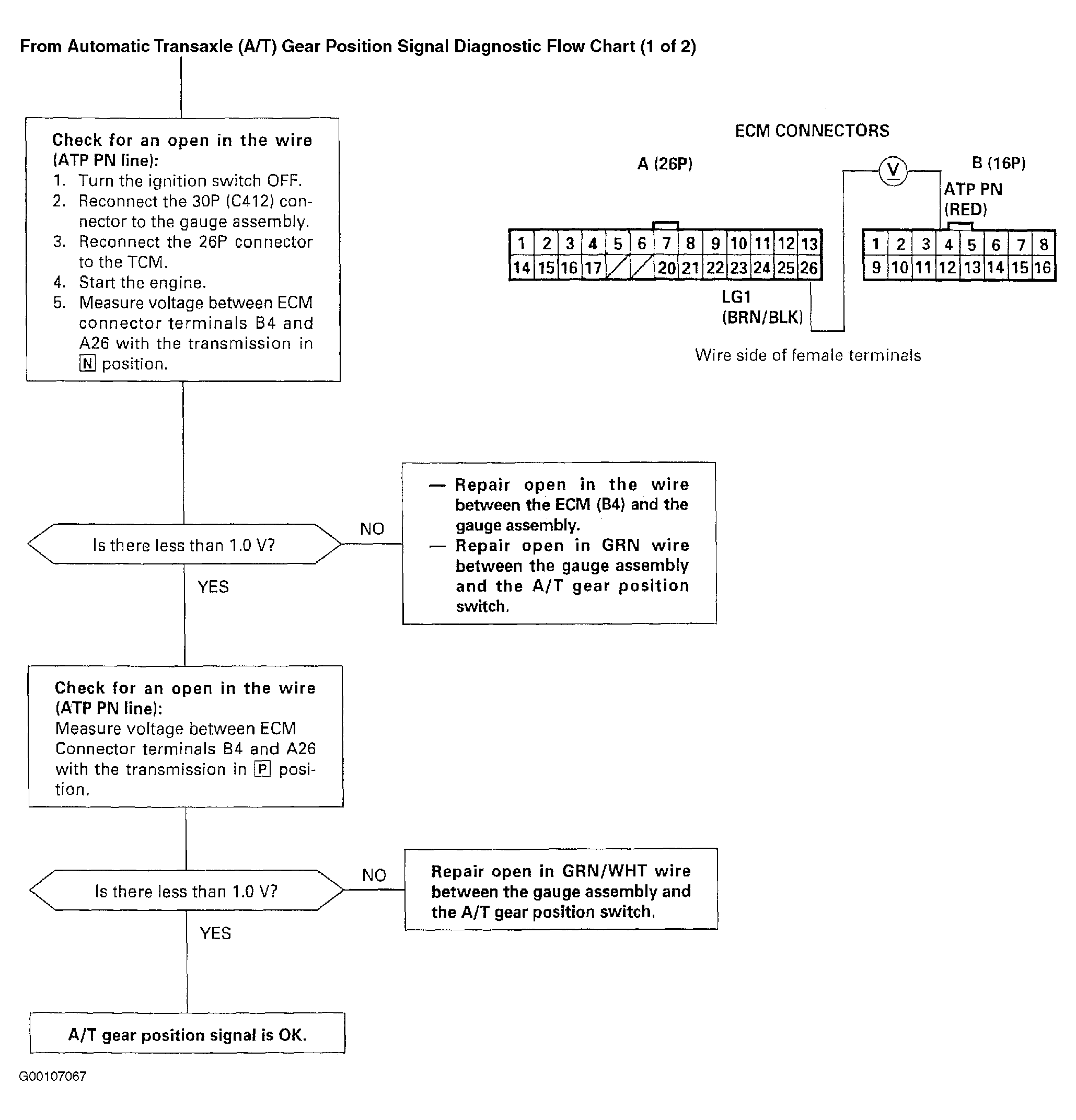 This signals the ECM when the transmission is in Neutral or Park. For troubleshooting of the A/T shift position signal circuit, see Fig 1