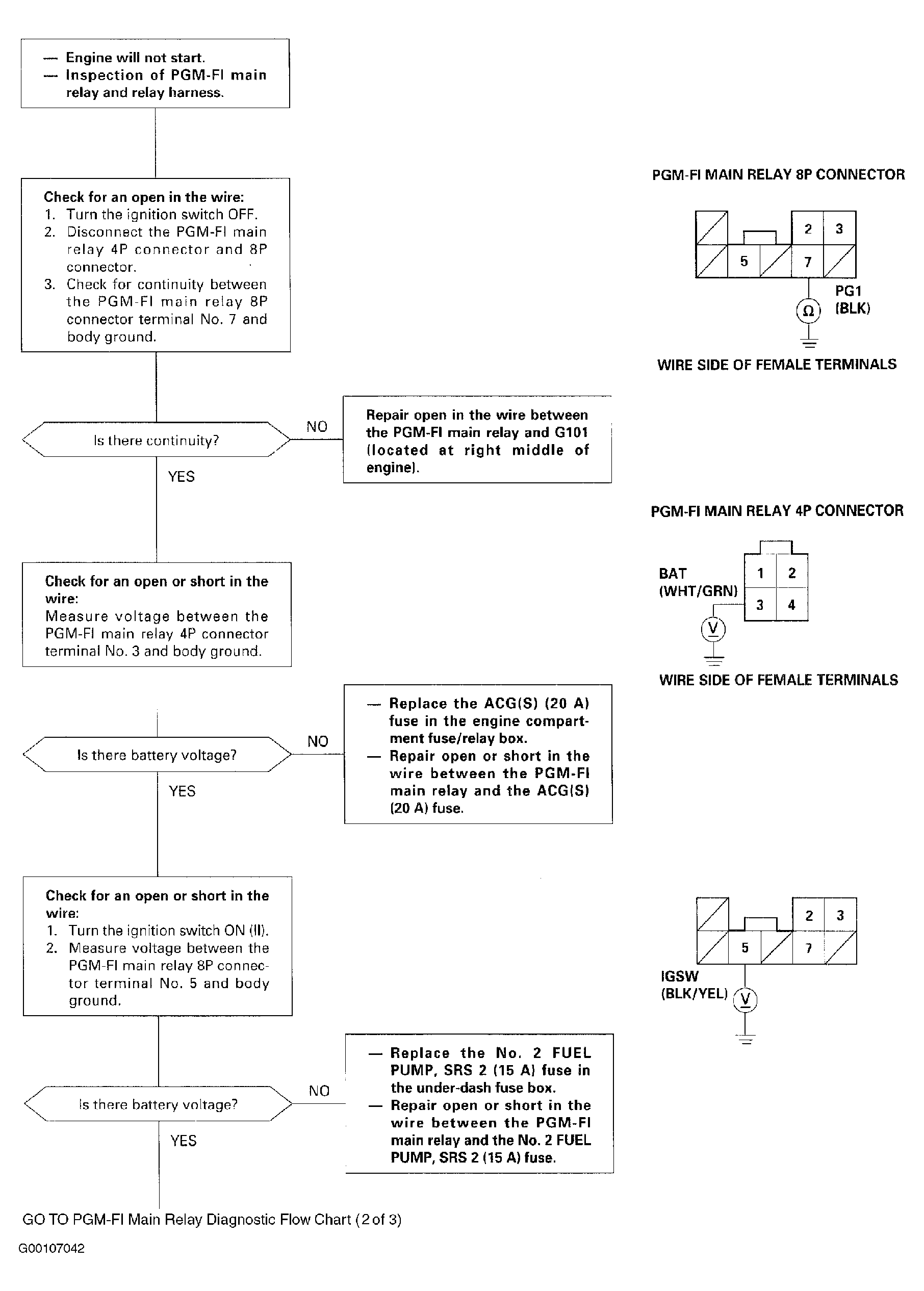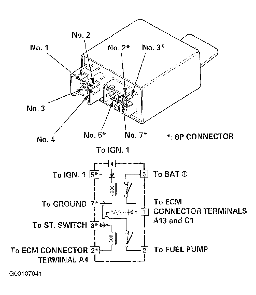 - Attach the battery positive terminal to the No. 1 terminal and battery negative terminal to the No. 2 terminal of the PGM-FI main relay. Then check that there is continuity between the No. 5 terminal and No. 2 terminal of the PGM-FI main relay. If there is no continuity, replace the relay and retest. If there is continuity, the relay is okay. If the fuel pump still does not work, test the PGM-FI main relay circuit according to the flow charts. See Fig 2 -Fig 4 .