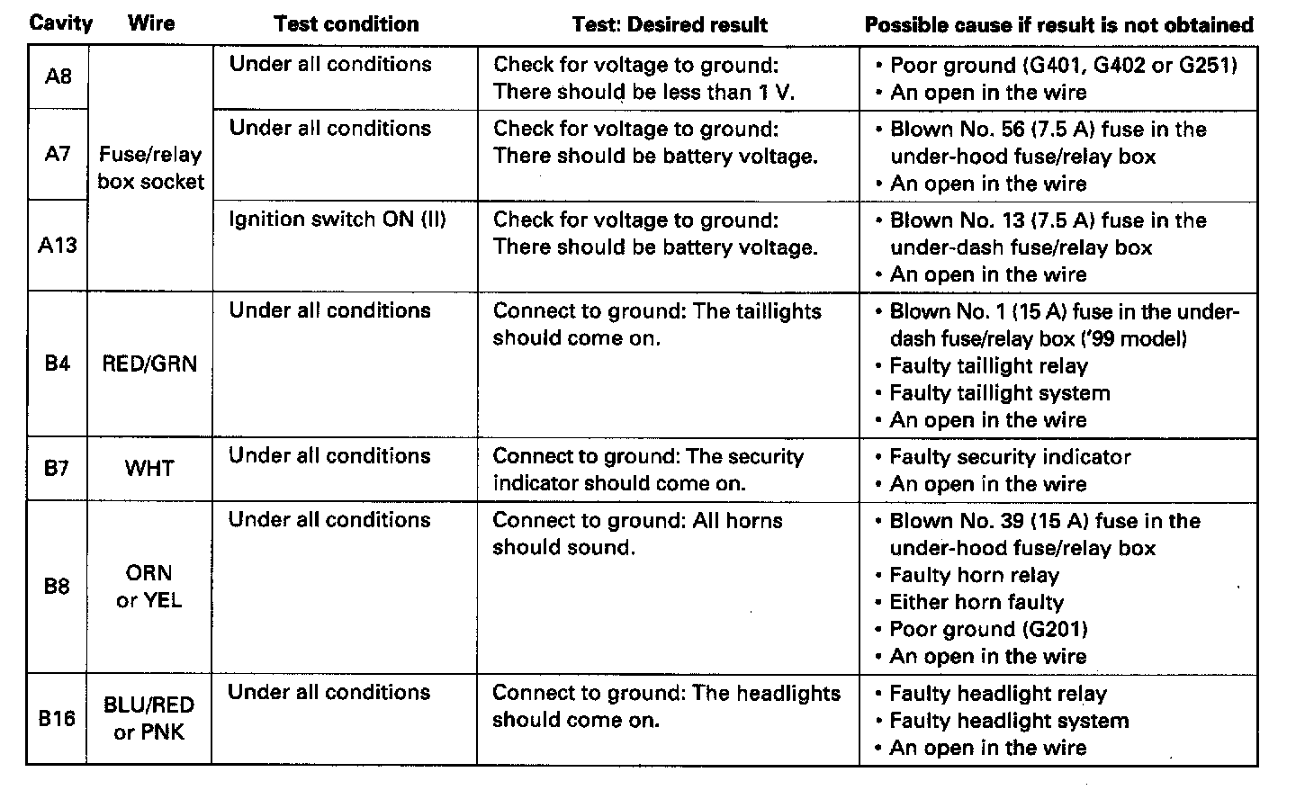 - If the terminals look OK, make the input tests as shown in the table at the connector and the fuse/relay box socket.