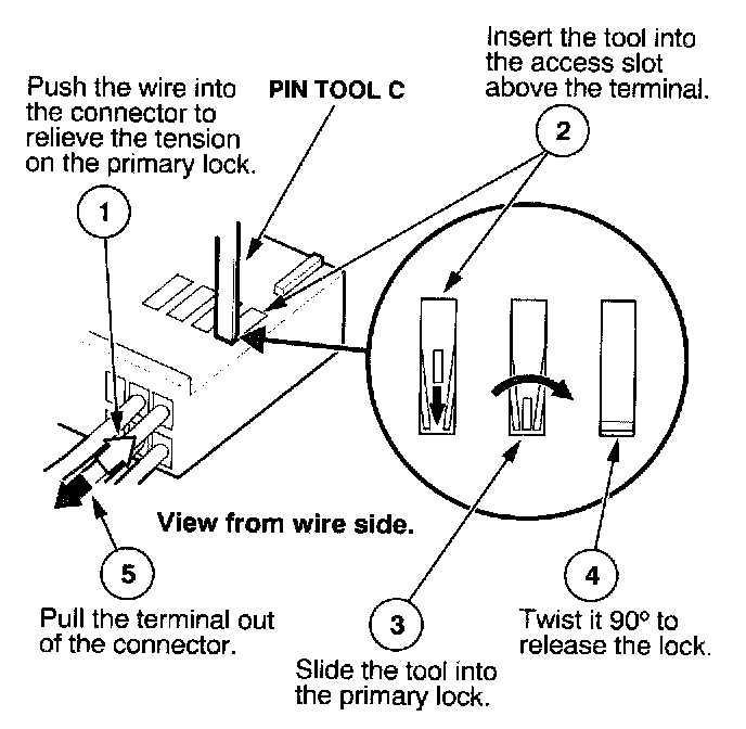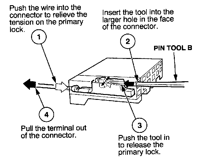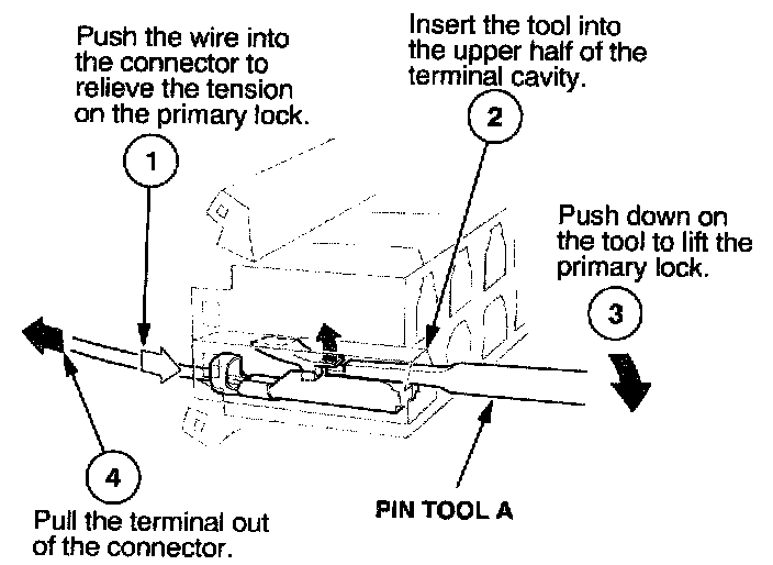 Before you begin, inspect the wire you are about to repair for damage and length. Make sure the wire will be long enough to make a terminal repair without stretching it when you reinstall the terminal in the connector. If the wire is too short, or if access to the connector is too restricted to make a terminal repair, you may need to install a pigtail terminal (a short length of wire with a factory-crimped terminal on it). Refer to HOW TO INSTALL PIGTAIL TERMINALS.