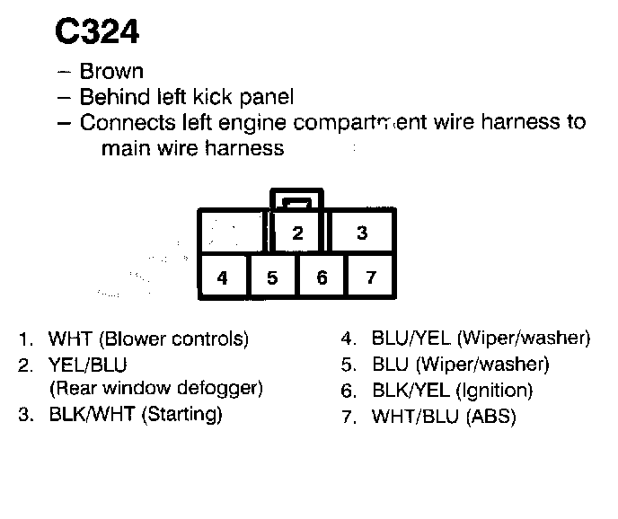 Example: The blower, rear window defogger, and the windshield wiper don't work. List all in-line and fuse box connectors in the blower controls circuit and then check the Connector View (sample above). You find that C324 is common to the blower controls, rear window defogger, and wiper/washer, so you inspect C324 and find the problem, bent terminals.