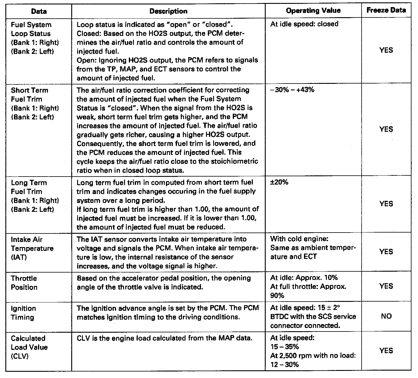 Home >> Acura >> 2000 >> RL V6-3474cc 3.5L >> Repair and Diagnosis >> Powertrain Management >> Computers and Control Systems >> Testing and Inspection >> Scan Tool Testing and Procedures >> Normal Scan Data Values