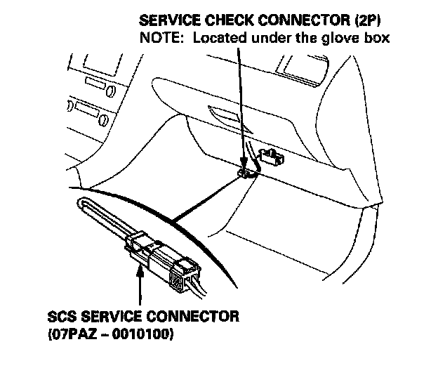2. Pull out the service check connector located under the glove box. Connect the GRN/BLK and RED wire terminals with the special tool.