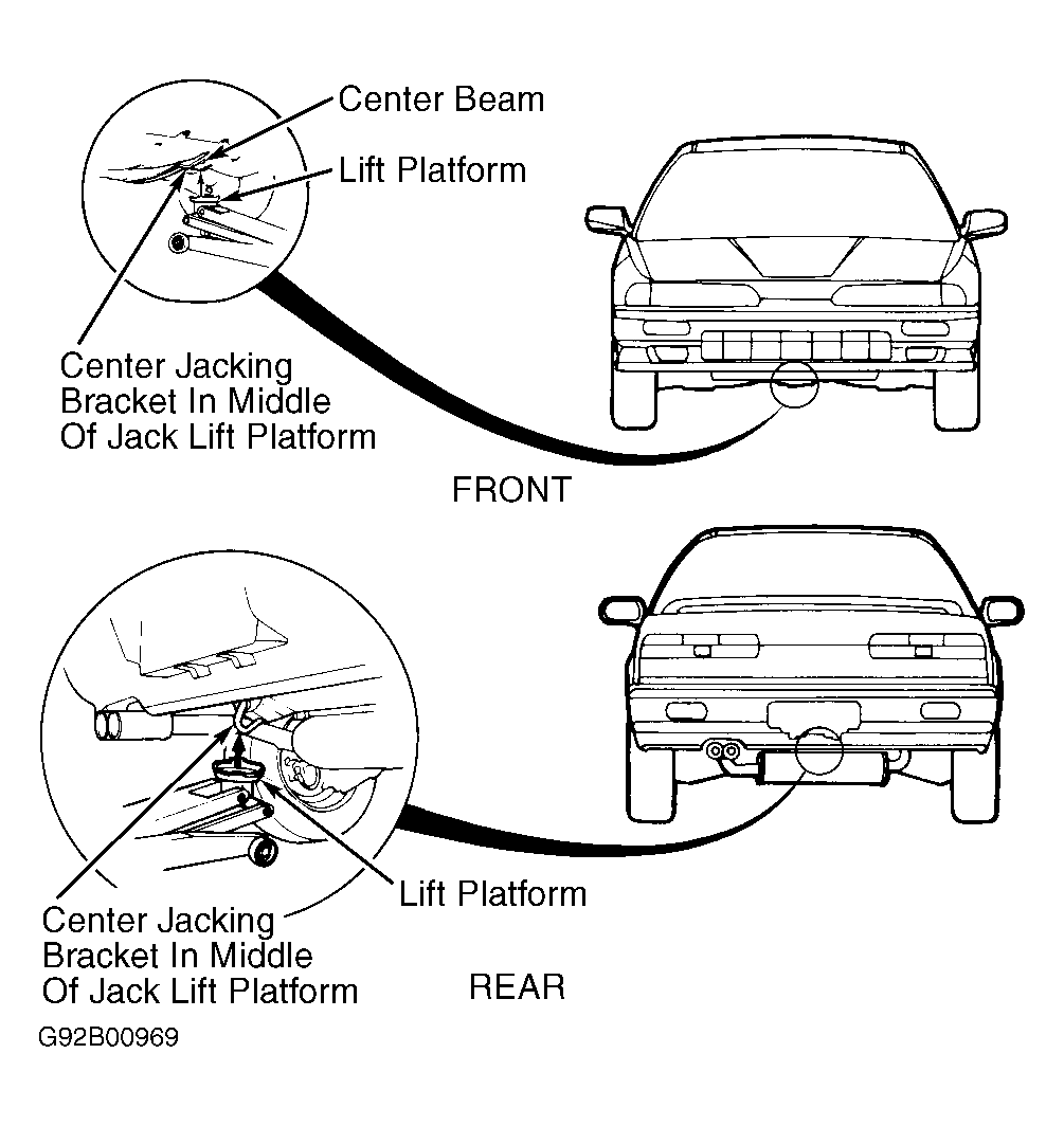 Set parking brake. Block wheels not being lifted. When lifting rear of vehicle, set manual transmission into Reverse, or automatic transmission into Park. Lift vehicle at indicated points. See Fig 1.