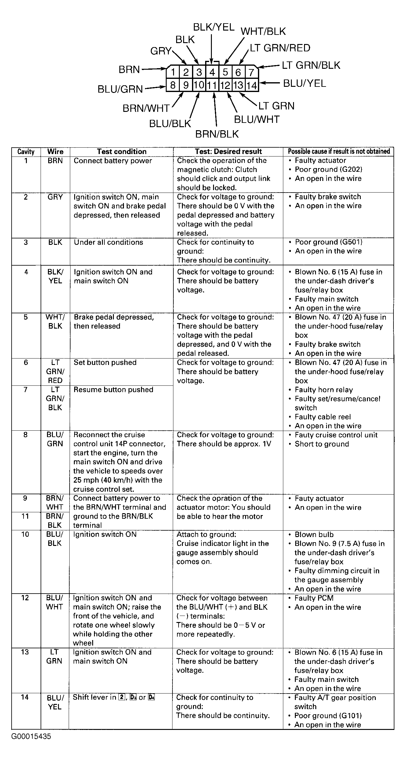 2. Disconnect cruise control unit 14-pin connector. Ensure connector and terminals are okay. Repair as necessary and retest system. If connector and terminals are okay, perform cruise control unit input tests. See Fig 1. If an input test indicates a problem, find and correct cause and retest system. If all input test results are okay, replace cruise control unit.