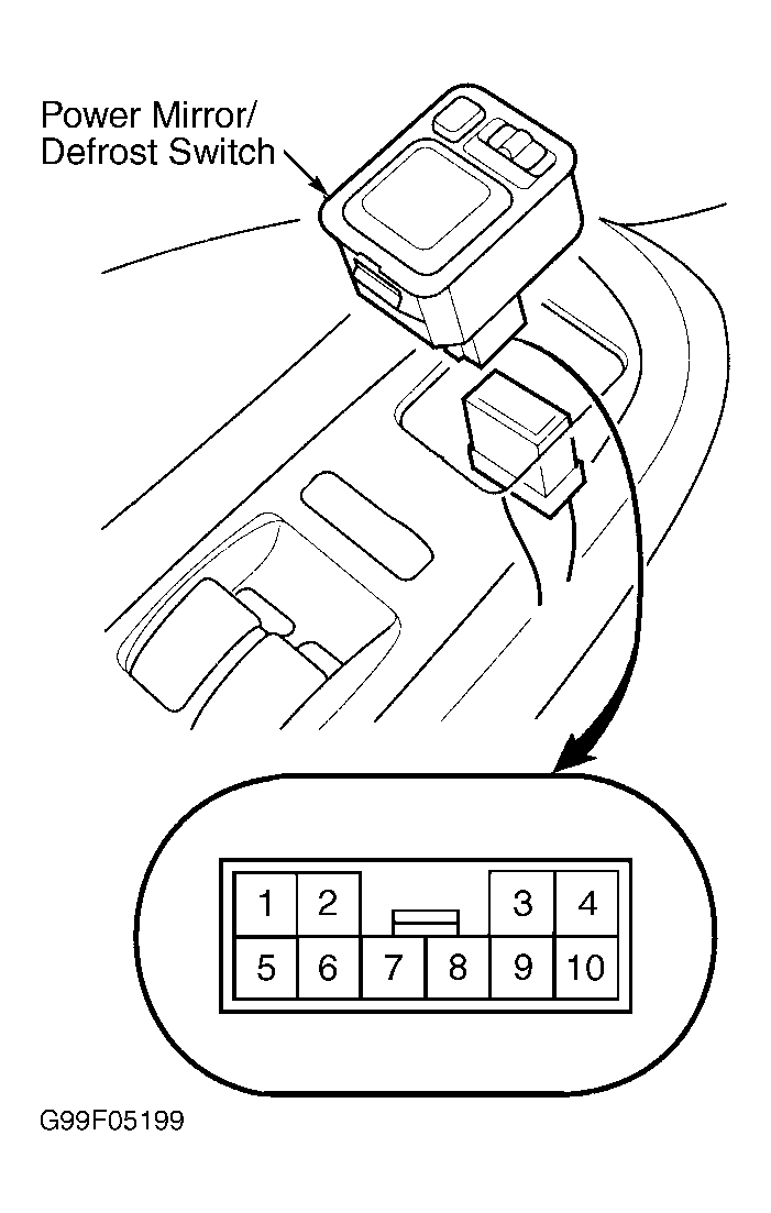 Gently pry power mirror switch upward to remove. Disconnect power mirror switch connector. Using an ohmmeter, verify continuity between switch terminals is as specified. See Fig 1 . See POWER MIRROR SWITCH CONTINUITY  table. If mirror switch fails any test, replace faulty mirror switch.