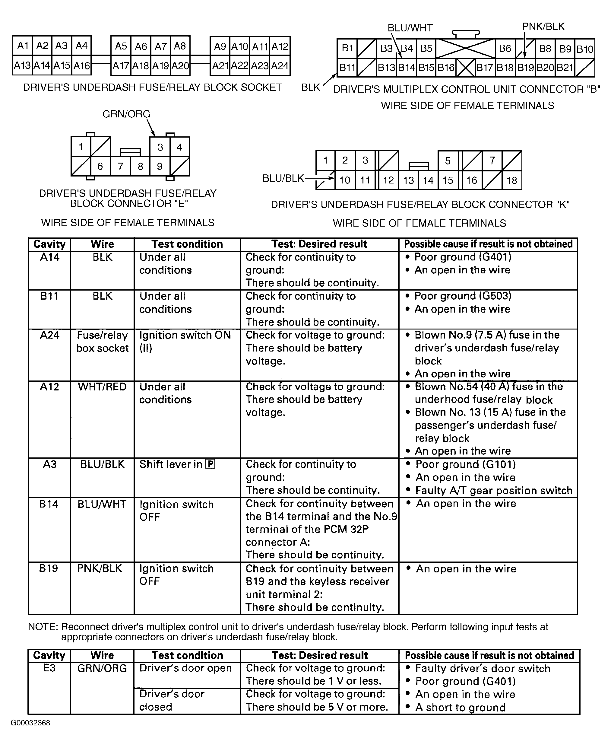 Remove driver's multiplex control unit from fuse/relay block located behind driver's kick panel. Disconnect driver's multiplex control unit connector and check for bent, loose or corroded terminals. Repair as necessary. If all terminals are okay, perform input tests at driver's multiplex control unit and fuse/relay block connectors. See Fig 1 . If all input tests are okay, one of the control units may be faulty. Substitute known-good control unit for control unit most closely related to problem. If problem still exists, substitute known-good control unit for next most closely related control unit. Retest system.