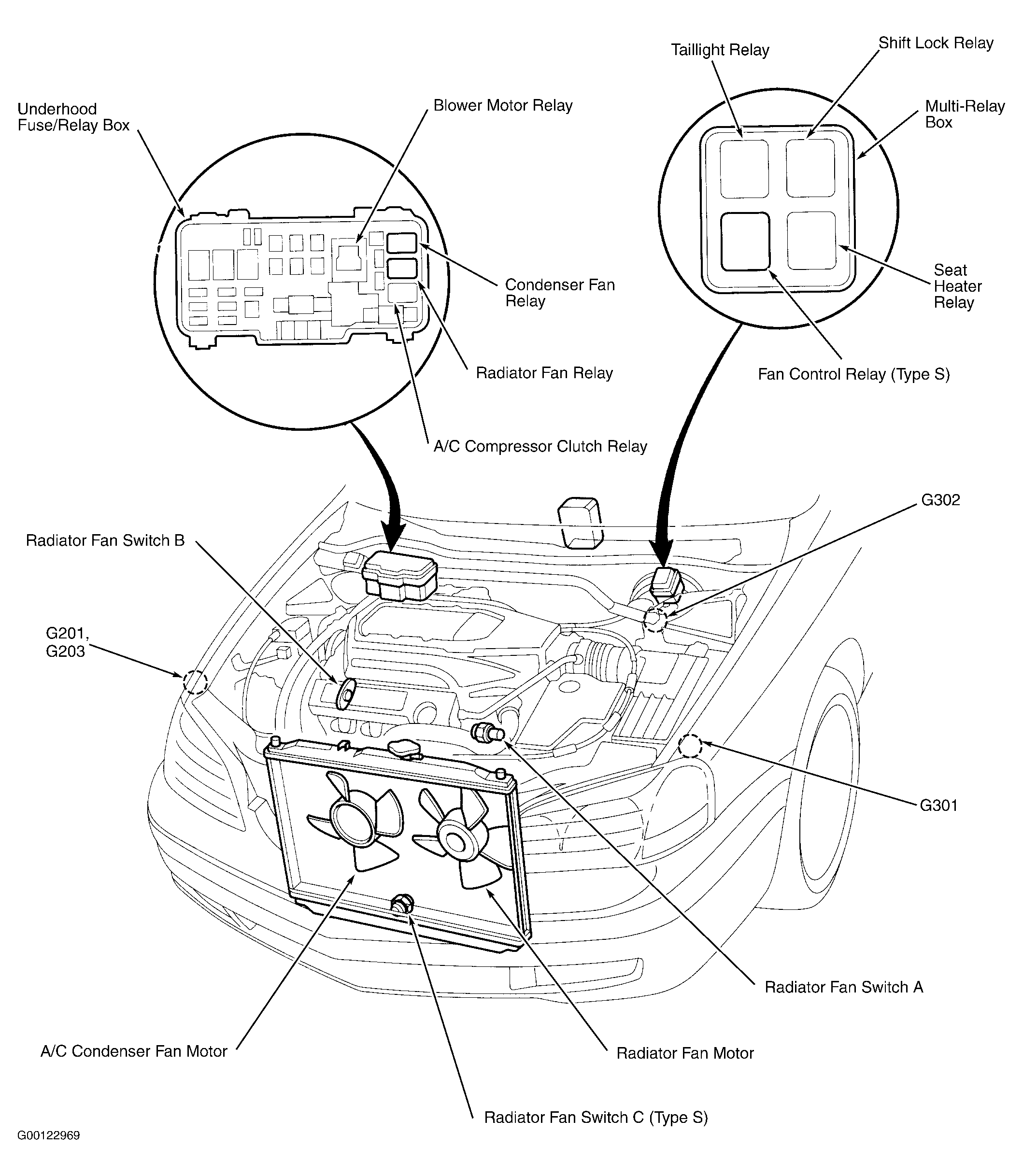 Multi-Relay Box At left rear corner of engine compartment. See Figure .