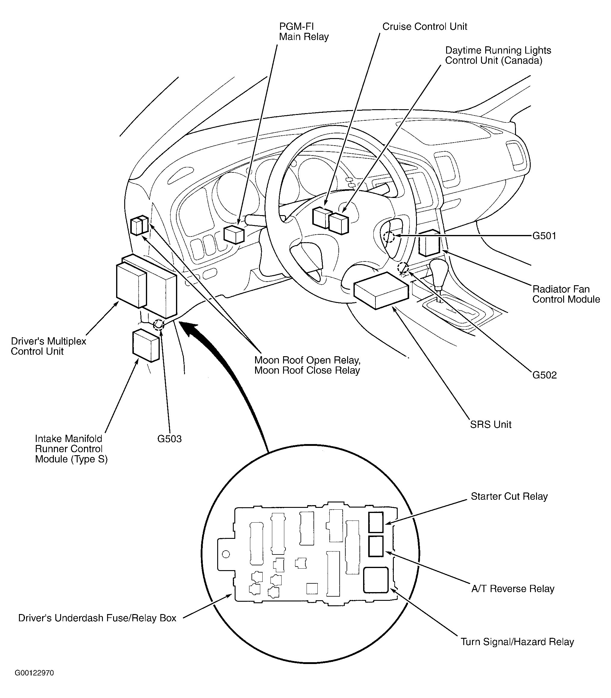 Driver's Underdash Fuse/Relay Box Behind left side of dash. See Figure .