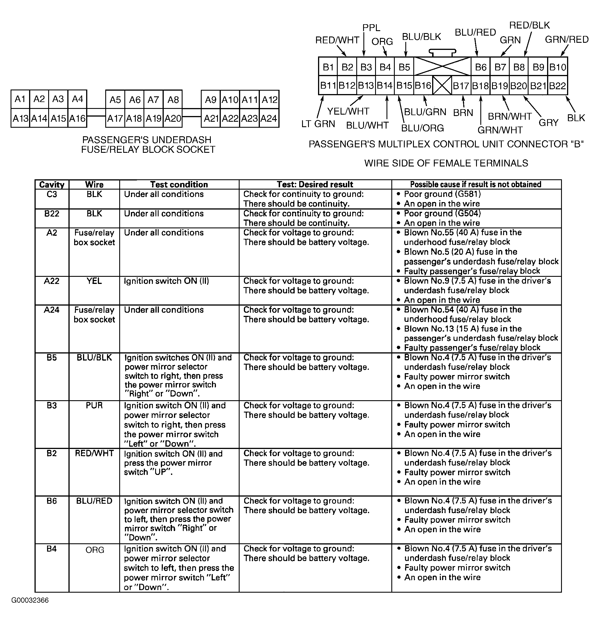 - Using DVOM to backprobe, measure voltage between passenger's multiplex control unit connector terminals B2 (Red/White wire) and B22 (Black wire) while holding mirror switch UP. If battery voltage exists, go to next step. If battery voltage does not exist, repair open circuit in Red/White wire between passenger's multiplex control unit and power mirror switch, or in Black wire between passenger's multiplex control unit and ground. See WIRING DIAGRAMS .