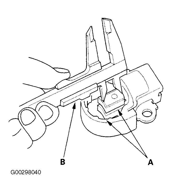 Measure the length of both brushes "A" with a vernier caliper "B". See Fig 1. If either brush is shorter than the service limit, replace the brush assembly. If brush length is OK, go to ROTOR SLIP RING .