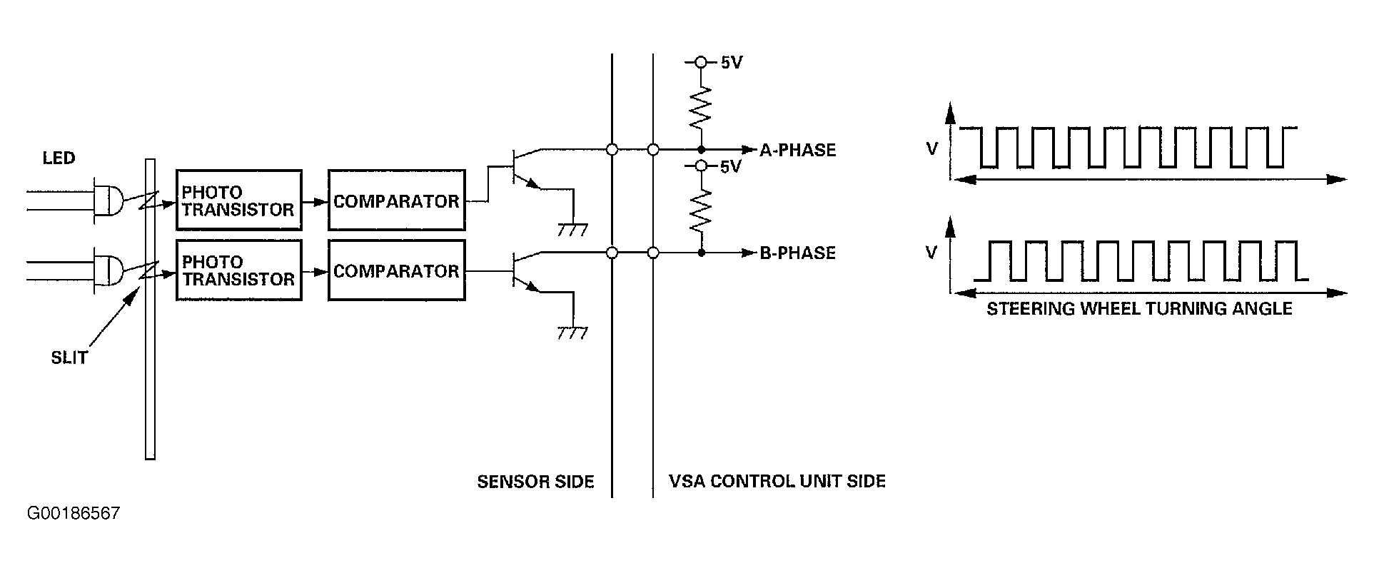 The steering angle sensor detects the steering wheel turning angle. A disk with evenly spaced slits is positioned between the facing parts of a light emitting diode (LED), and a light receiving part (photo transistor). As the disk rotates, it interrupts the light from the LED. The light which passes through a slit is converted into electric current by the photo transistor, and the waveform of this electric current is converted by the comparator into a square wave output of the disk's rotation. The analysis performance of the system is improved by providing the fixed slit in front of the LED, and thereby identifying the brightness and darkness of the light which is received at the photo transistor. The output signal is a 2-phase output (A-phase and B-phase), and the steering wheel turning angle and the turning direction are calculated by the VSA control unit. See Fig 1 .