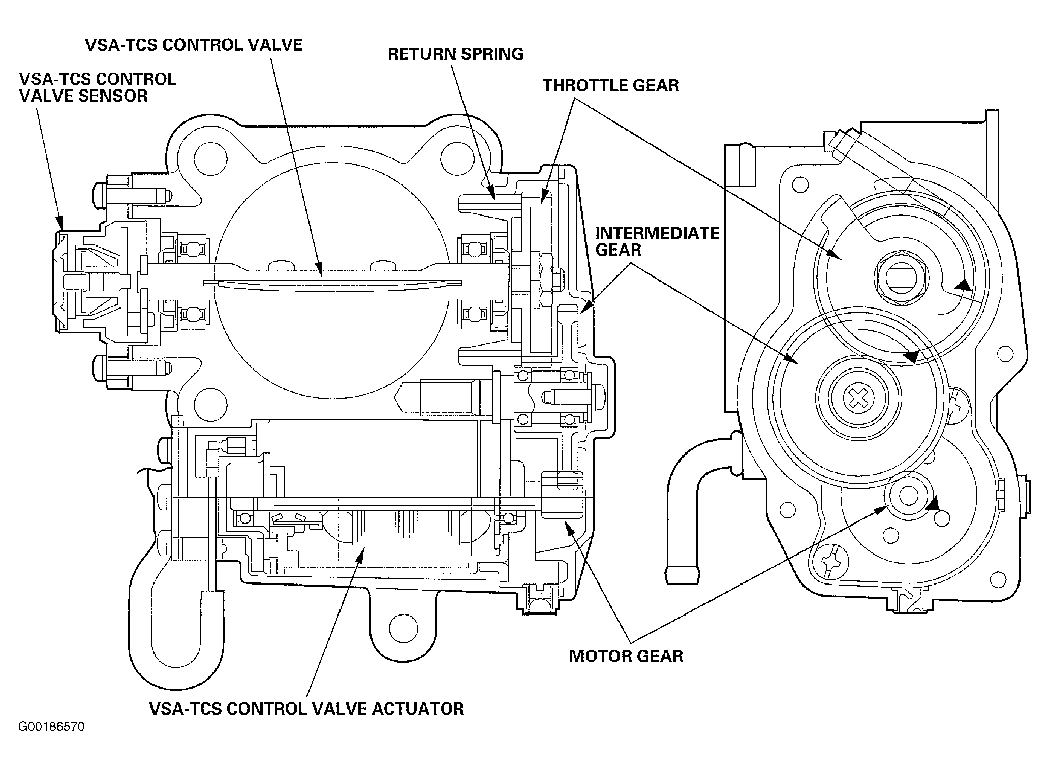 The VSA-TCS control valve assembly consists of the VSA-TCS control valve actuator (DC motor), VSA-TCS control valve sensor, VSA-TCS control valve, return spring, and three gears. When the TCS is activated, the VSA control unit signals the VSA-TCS control valve actuator and the PCM. The actuator is linked to the VSA-TCS control valve which is normally returned to the fully open position by the return spring. Although the throttle valve is still within the driver's control, the engine output is reduced by the VSA-TCS control valve and the PCM to achieve optimum traction. See Fig 1 .