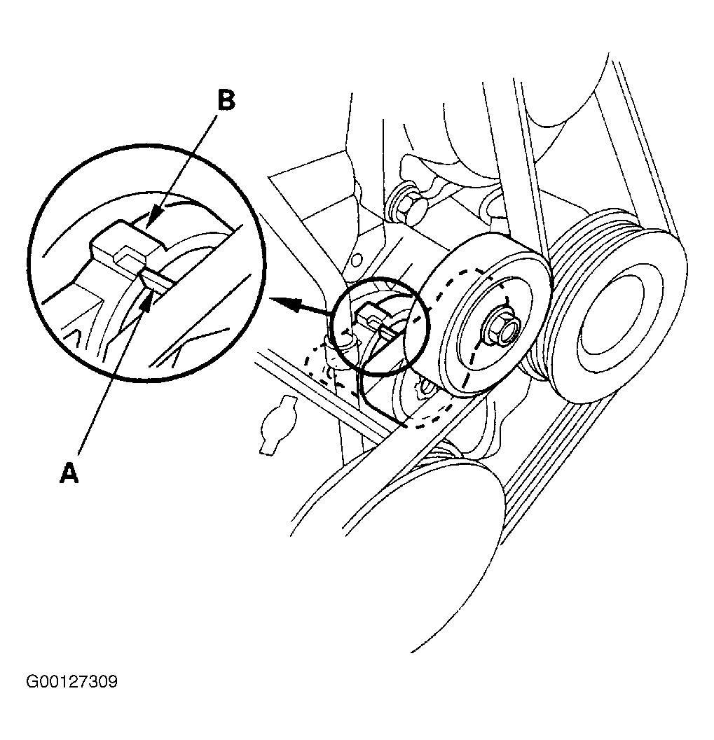 - Check that the pointer (A) on the auto-tensioner housing is not beyond the edge of the indicator rib (B) on the tensioner base. See Fig 1.