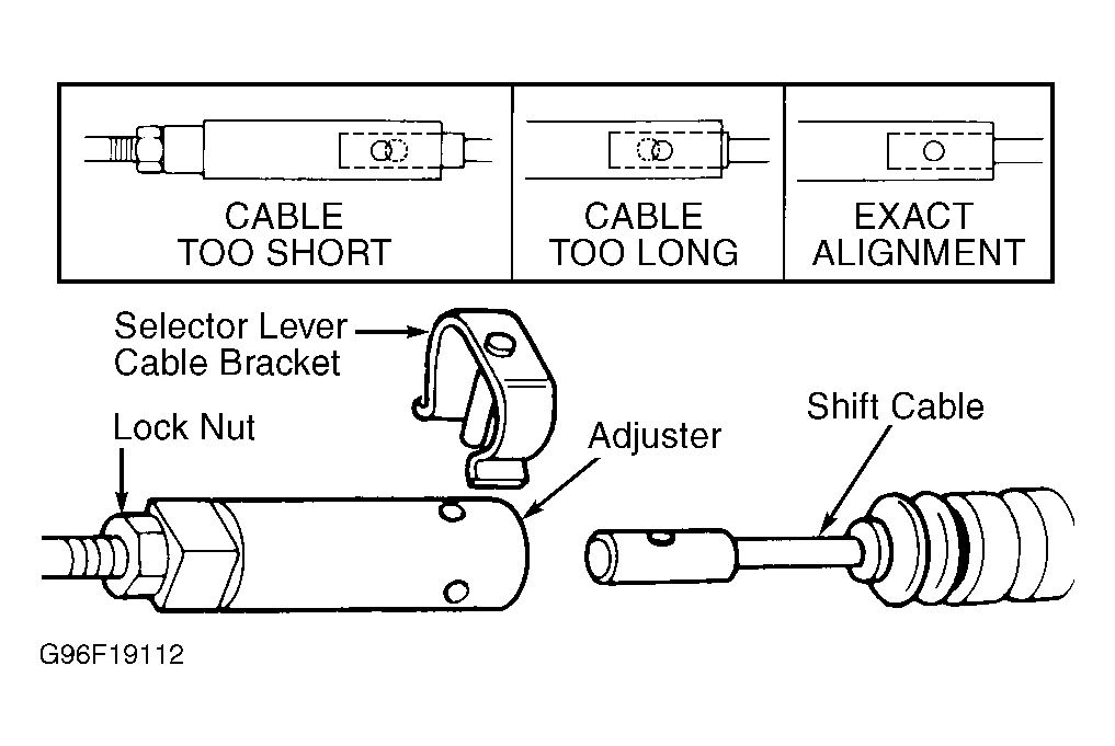 - When installed, selector lever cable bracket should not bind. If selector lever cable bracket binds, cable is still out of adjustment. Repeat adjustment procedure. Start engine, and check shift lever selection of all gears.