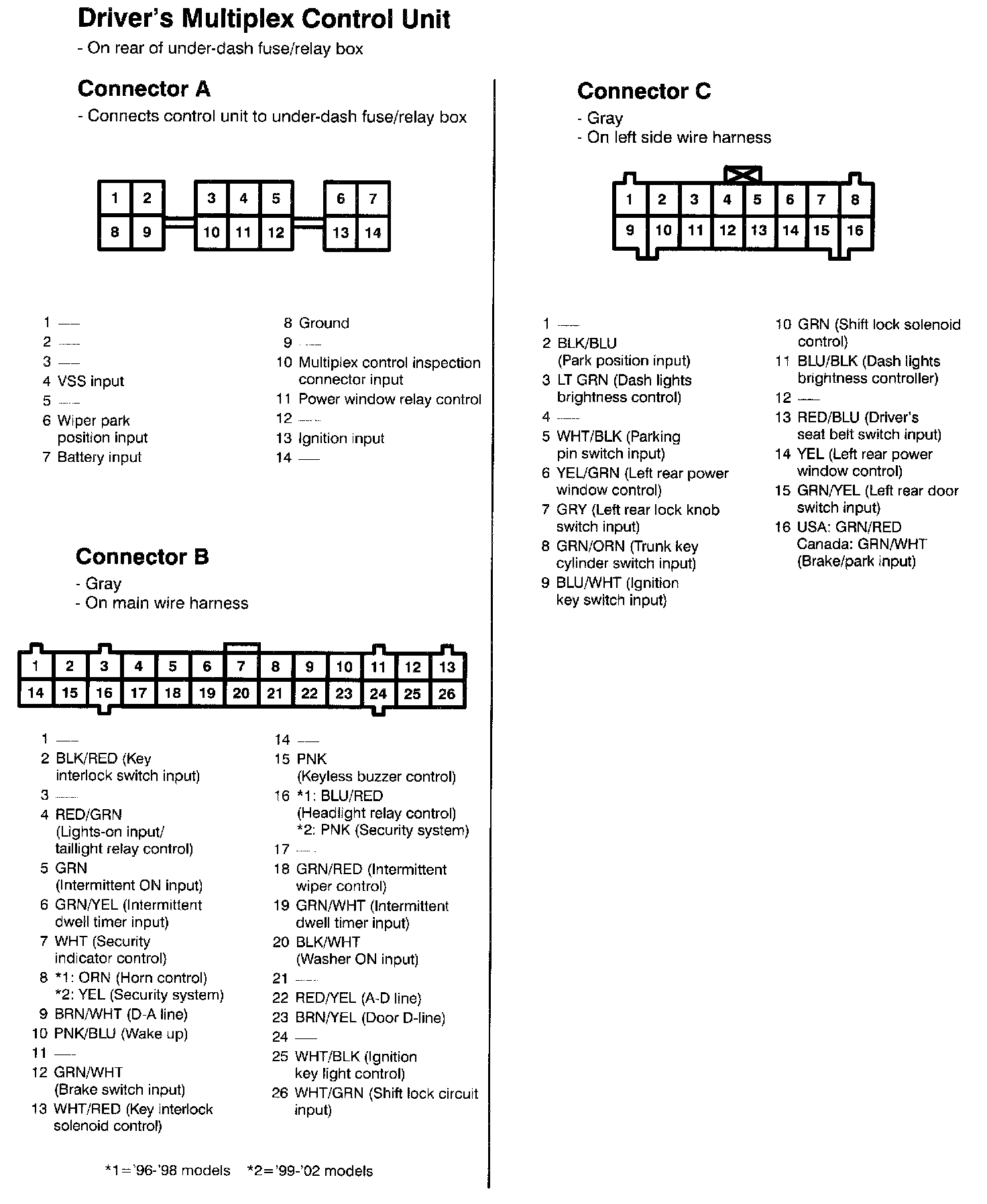 Driver's Multiplex Control Unit Connectors A - C: